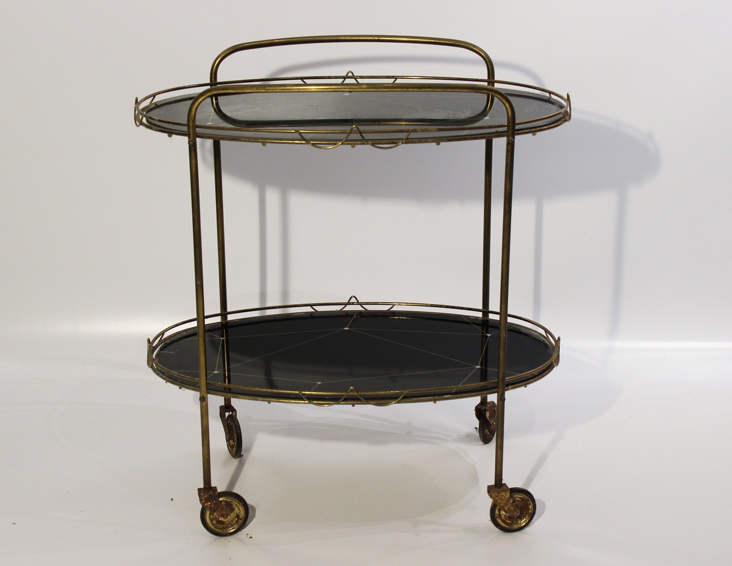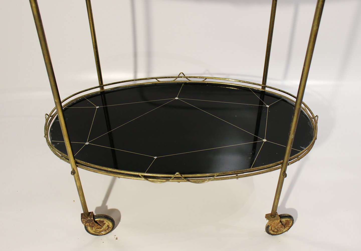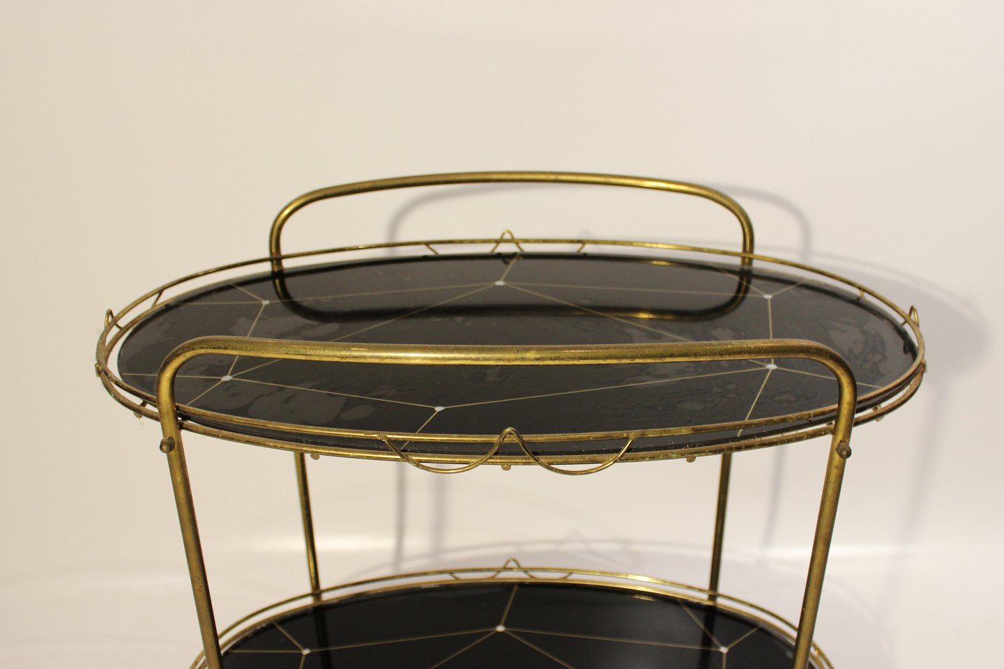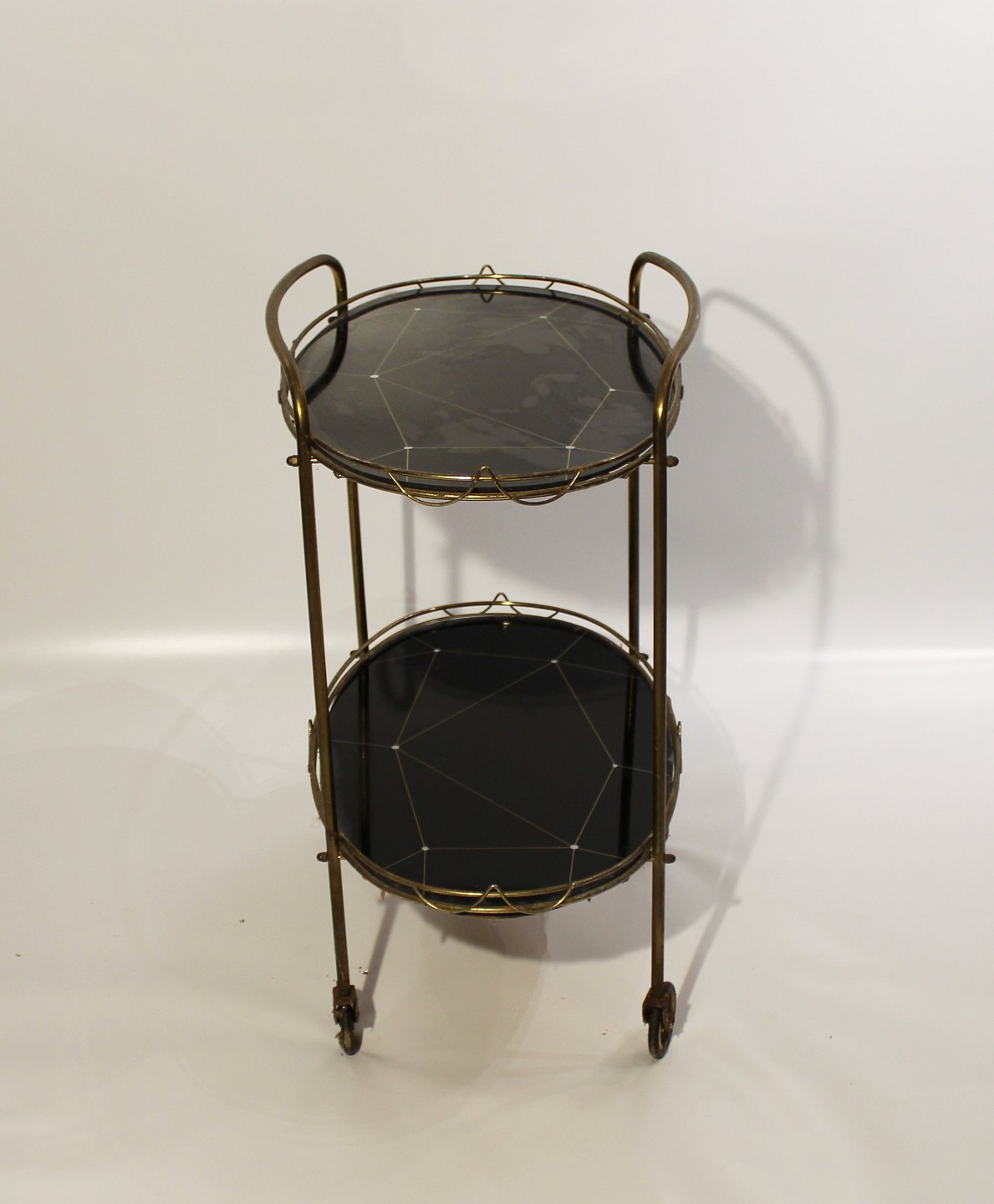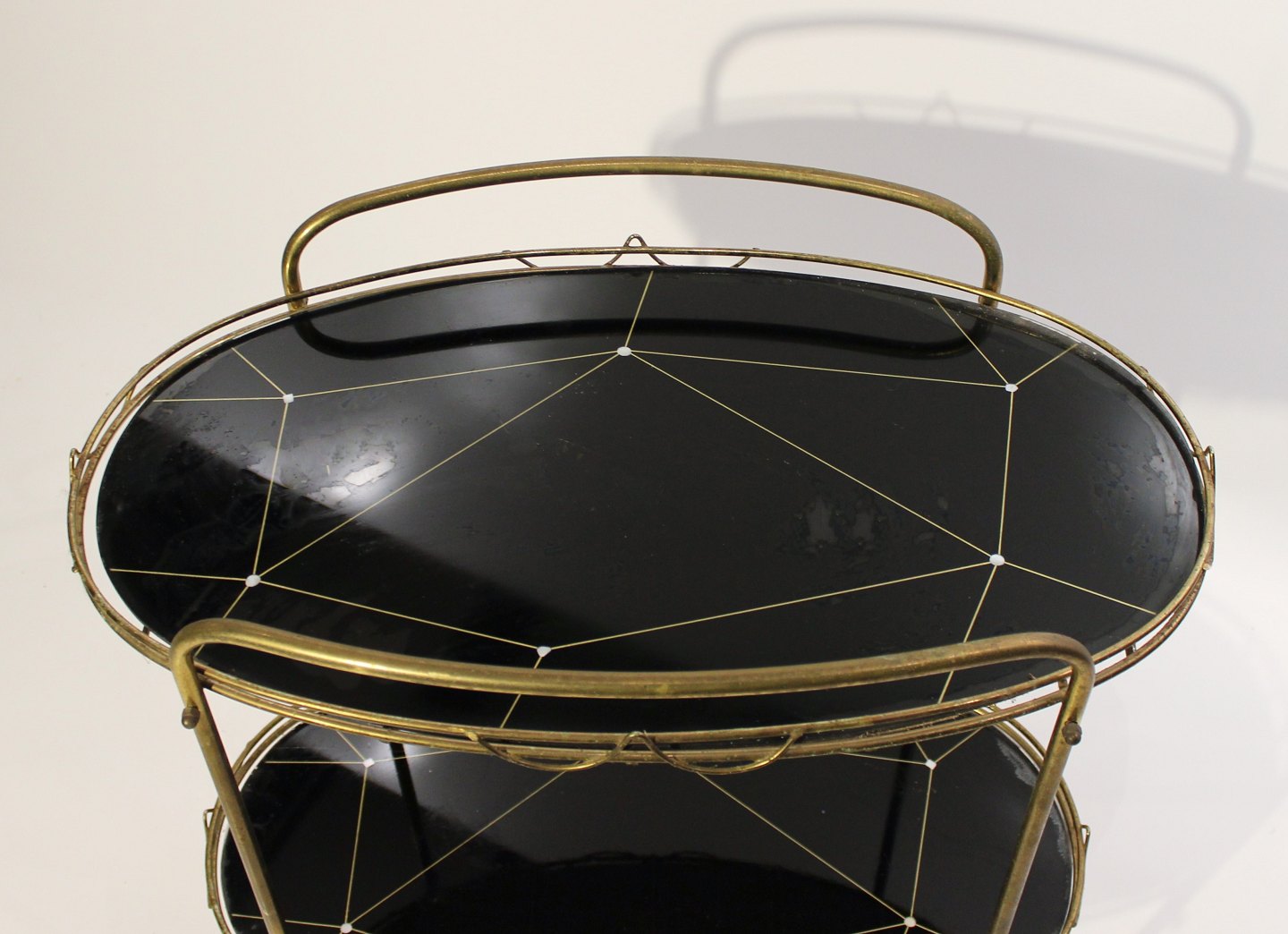 SoldTray table with patterned black plates and frame of brass from the 1930s. The table is in great vintage condition.