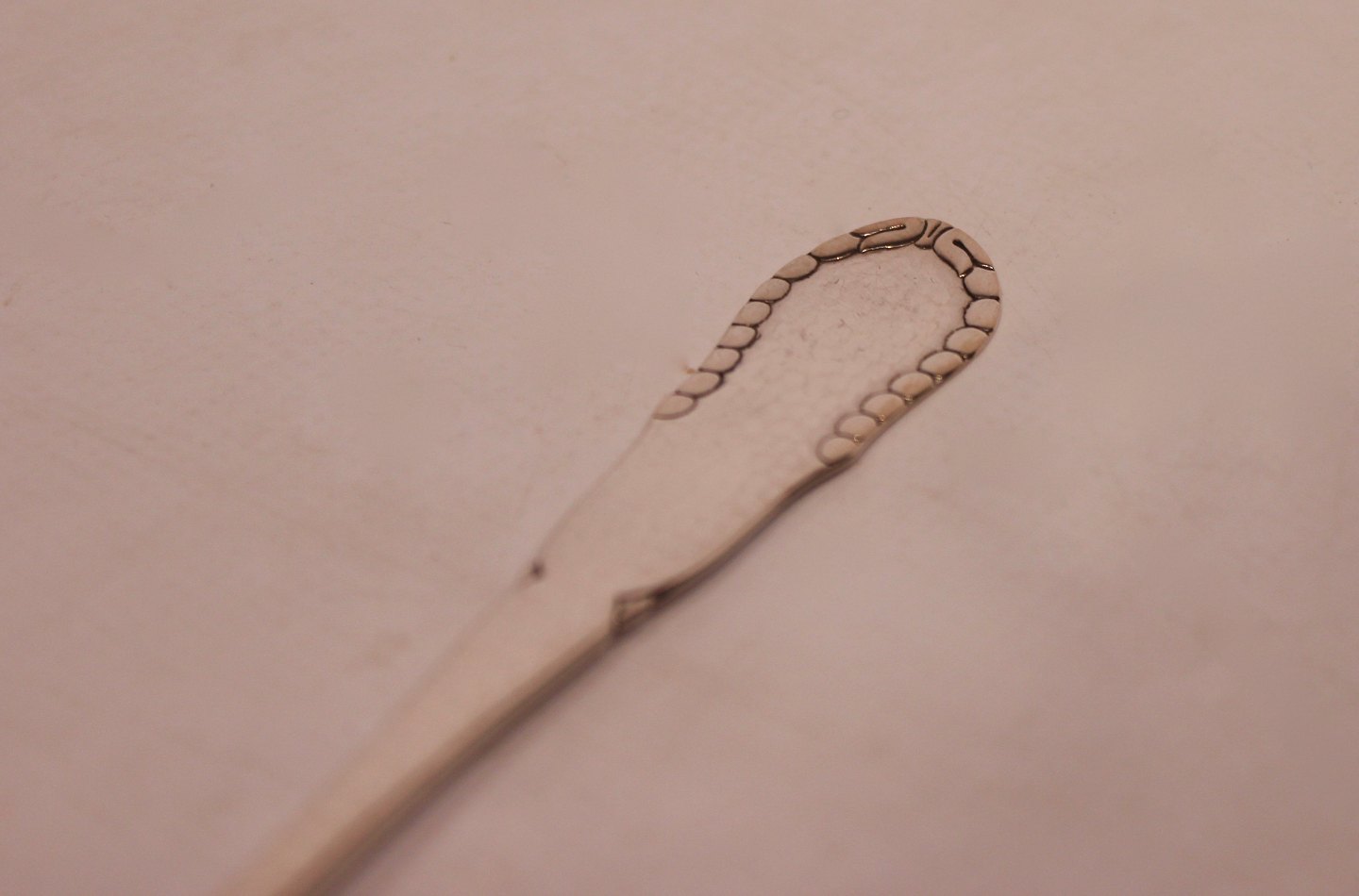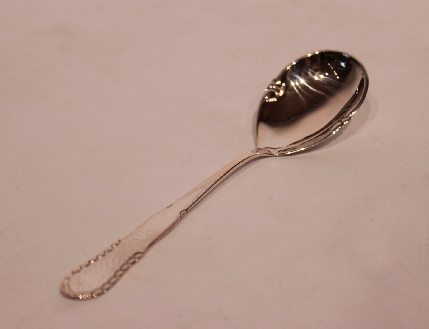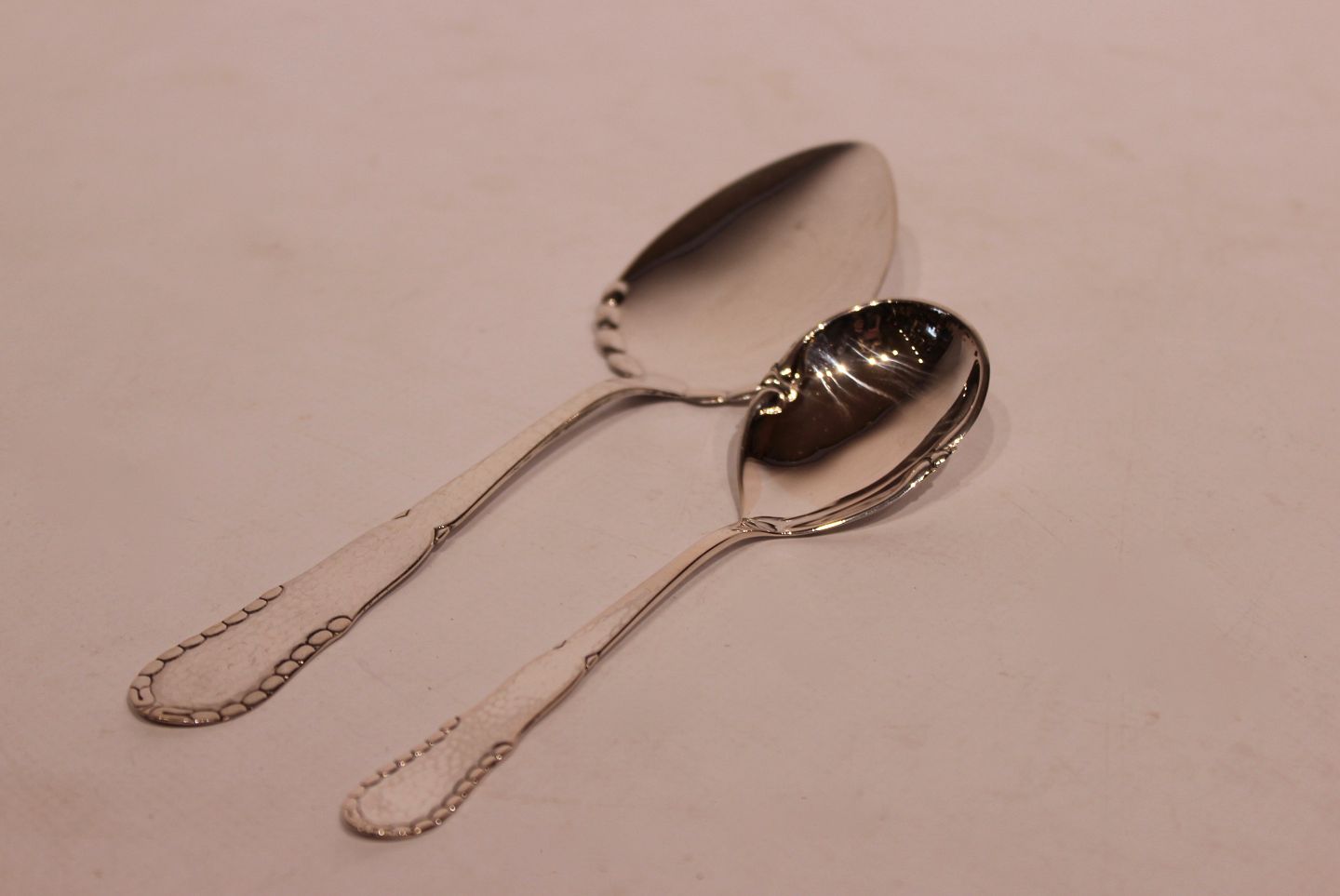 View the price in the text descriptionSmall serving spade and compote spoon in the pattern Dagmar of three-towered silver.