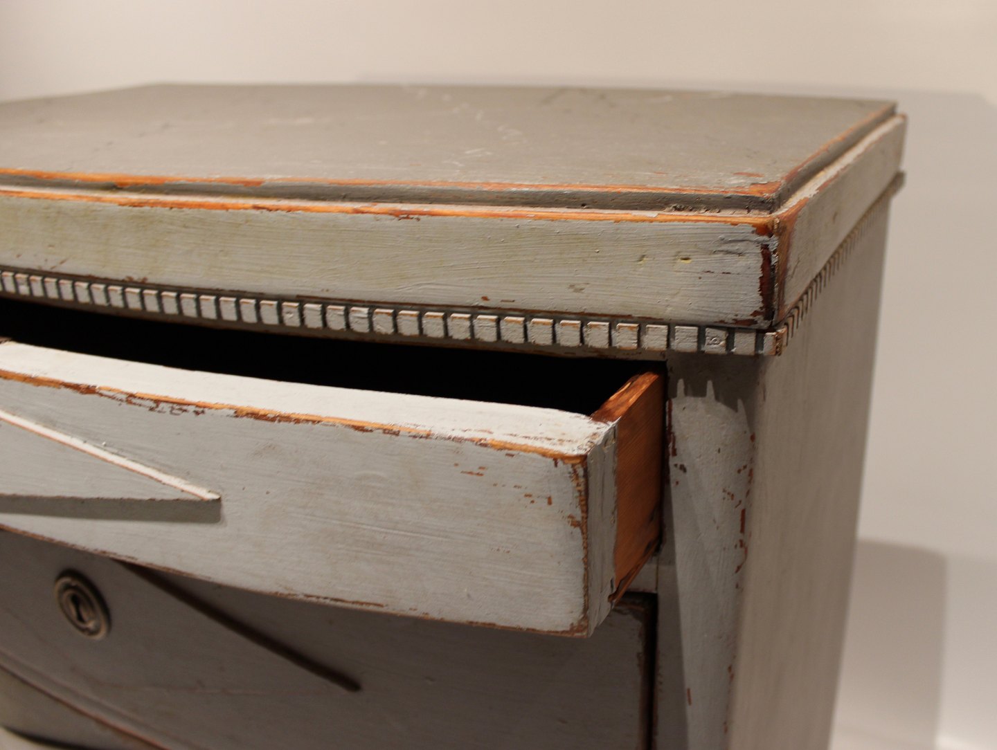 Gustaviansk gråmalet kommode med buet front og marmoreret topplade fra 1830erne.
