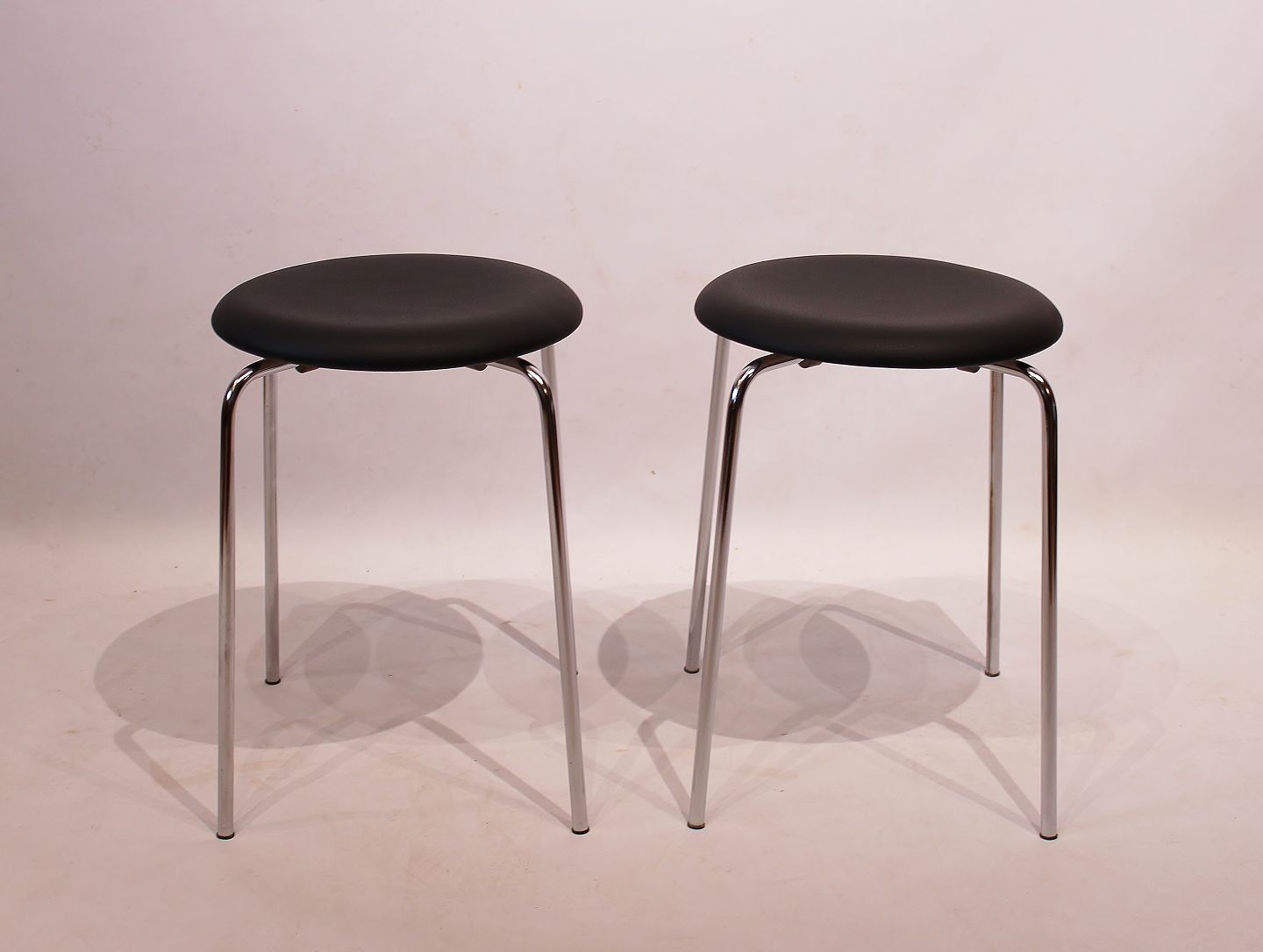 Dot stools in black leather are an elegant and timeless accessory for any modern home. Designed by the renowned Danish architect Arne Jacobsen and produced by the renowned furniture company Fritz Hansen in 1971, these stools carry with them the aesthetics of Scandinavian design tradition.