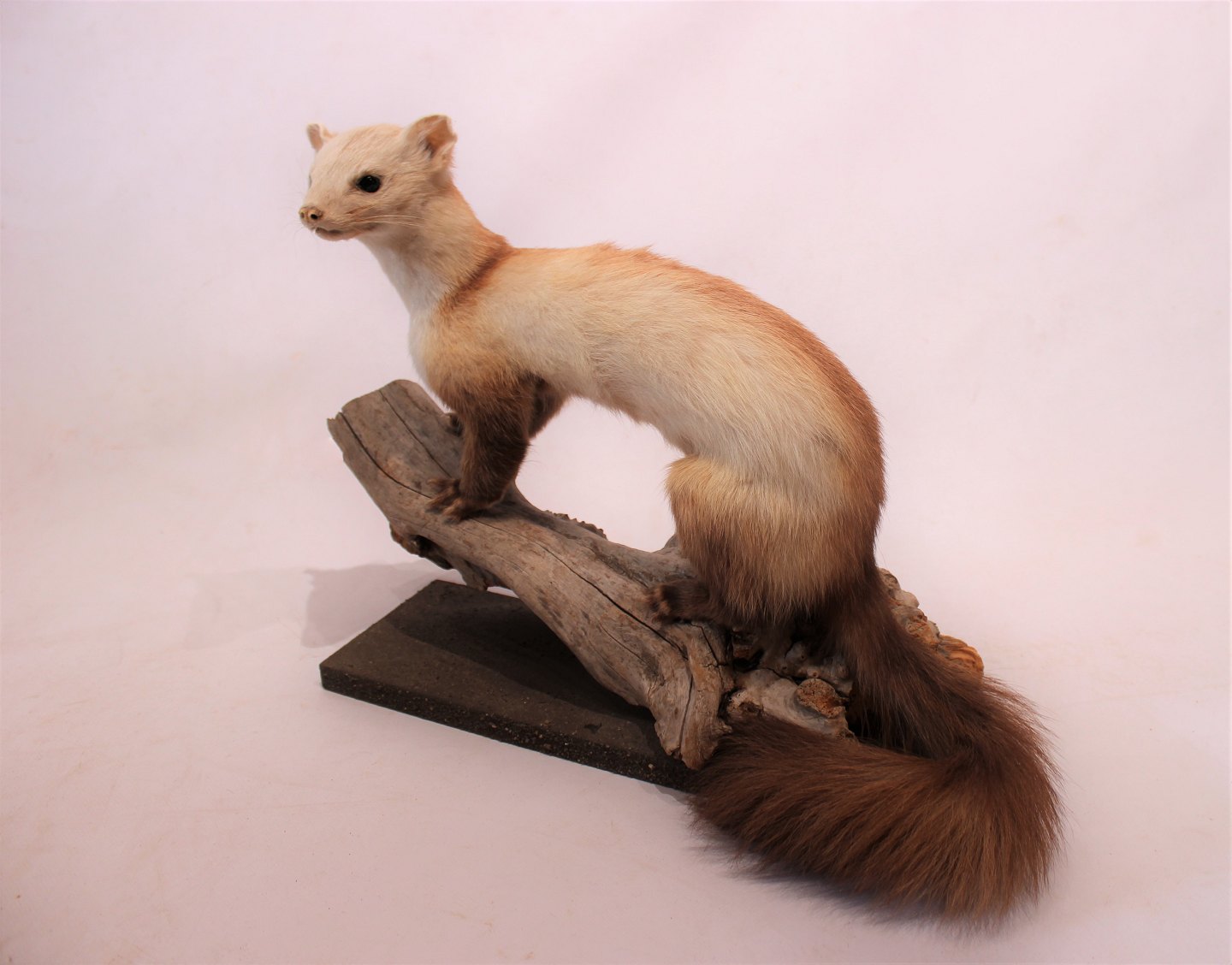 Udstoppet husmår siddende på træstamme fra 1980erne. Dyret er i flot brugt stand.