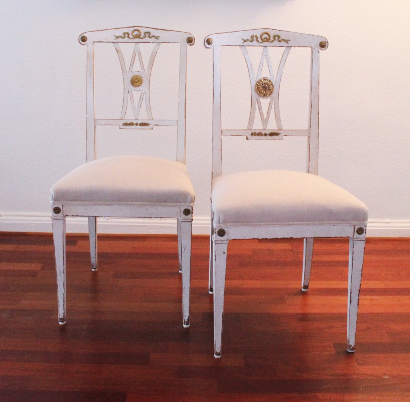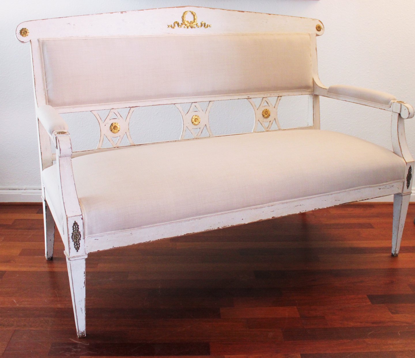 Kontakt os vedrørende prisGustaviansk sæt bestående af sofa, sidebord, to armstole og 2 spisestuestole, dekoreret med bronze ornamenter. Sættet er i flot brugt stand og fra år 1840.
