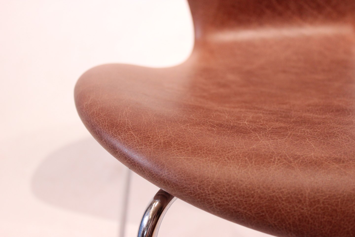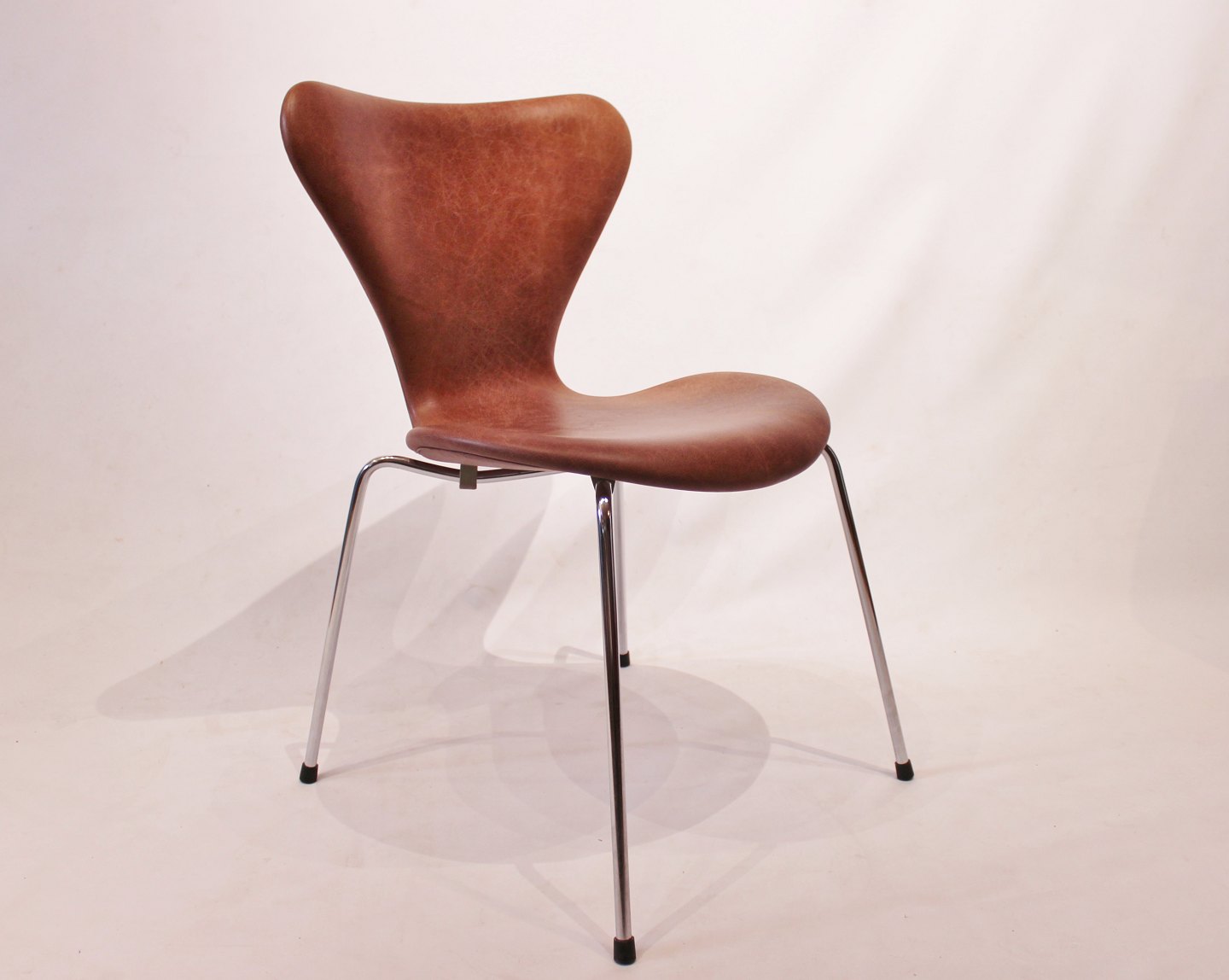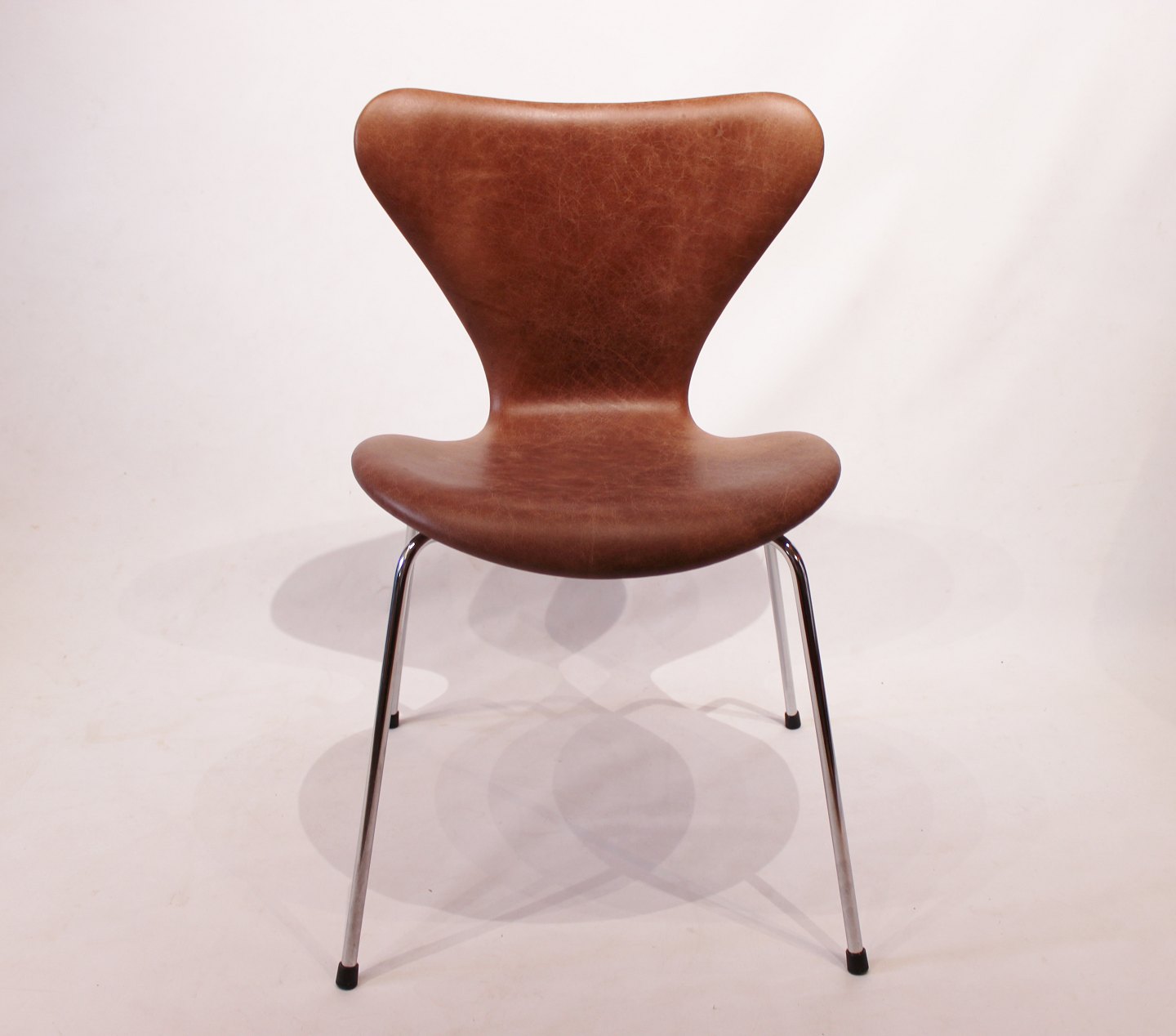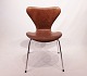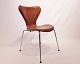 A set of 6 Seven chairs, model 3107, designed by Arne Jacobsen and manufactured by Fritz Hansen in the 1980s. The chairs are newly upholstered in cognac patinated leather and in great condition.