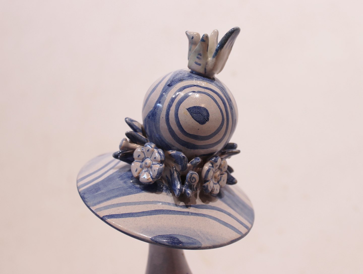 SolgtKeramik figur "Forår", M20, fra serien "De fire årstider" designet af Bjørn Wiinblad. Denne figur blev lavet i 1978 og er dekoreret i blå og hvide farver.