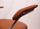 Arne Jacobsen originally designed this chair for the SAS Royal Hotel in Copenhagen, where it became an integral part of the hotel's famous interior. The chair is constructed with a solid frame and chrome armrests that provide stability and support, while the inviting and luxurious cognac colored leather upholstery adds elegance and warmth to any room.