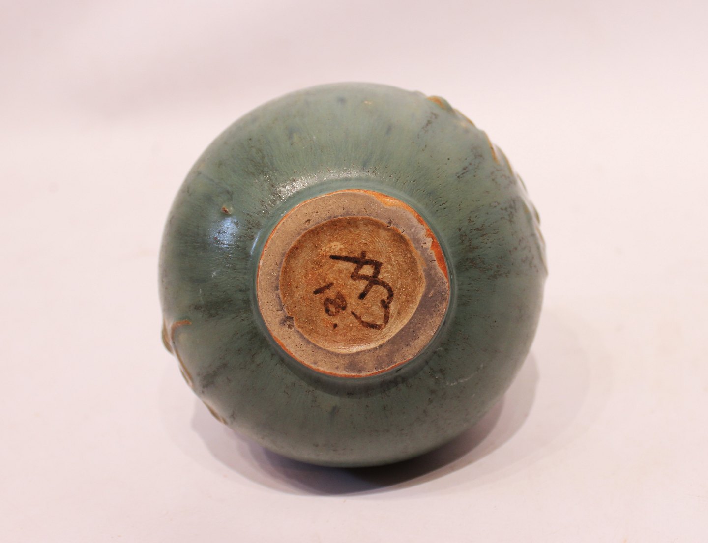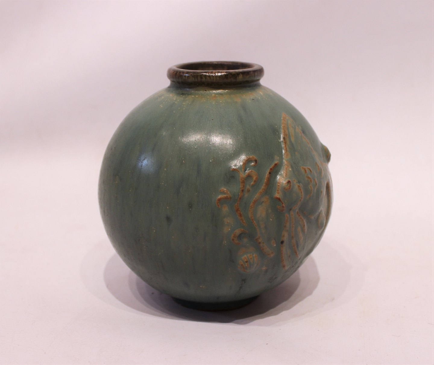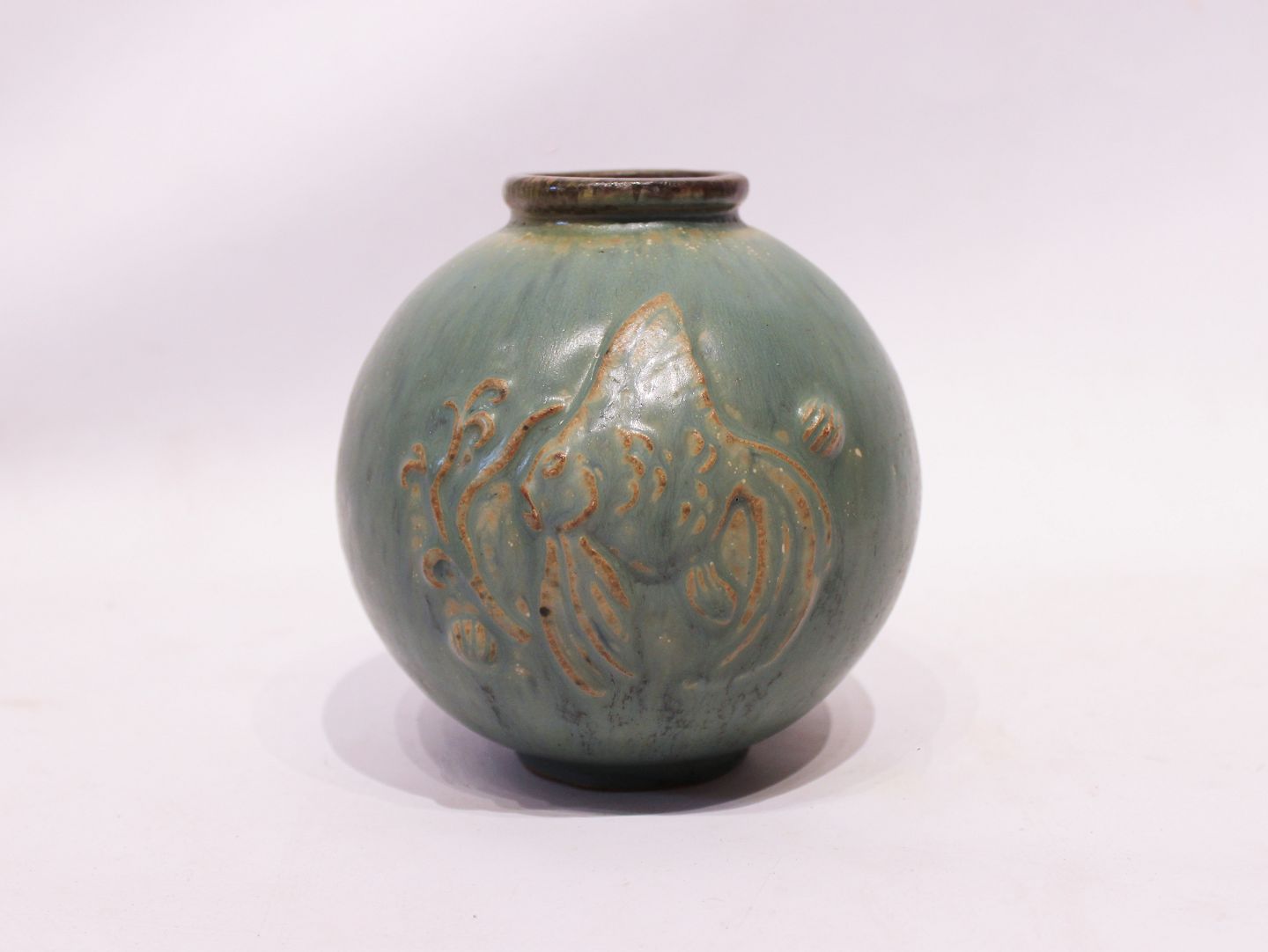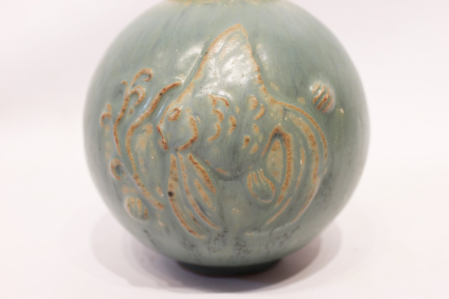 SoldCeramic vase in turquoise colors decorated with fish motif, no. 18, by Arne Bang. The vase is in great vintage condition.