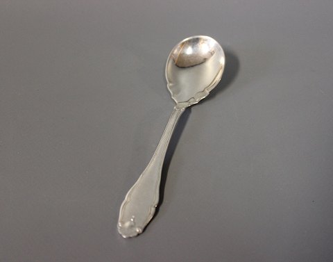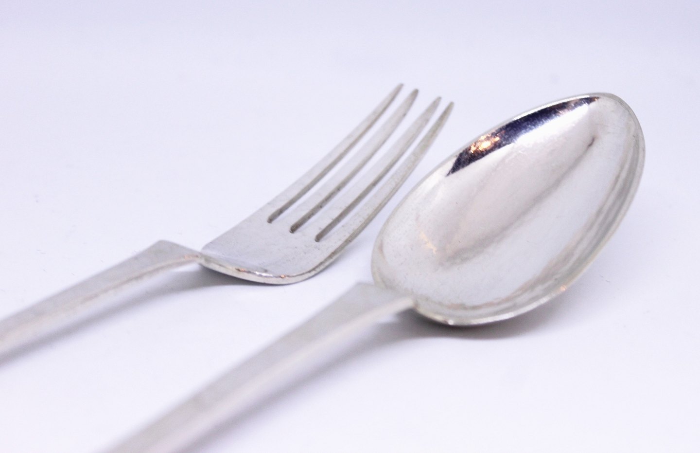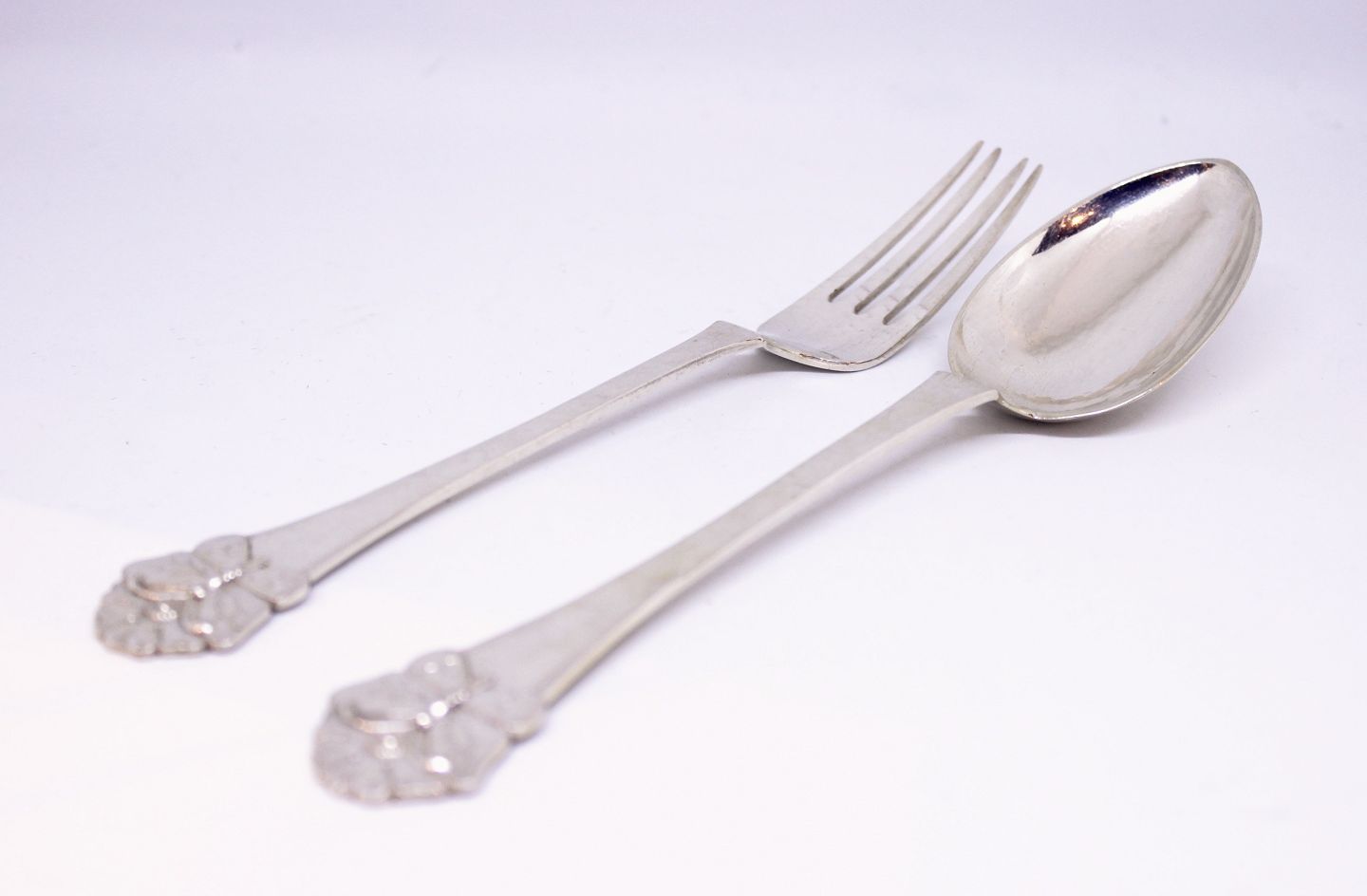 Middagsgaffel og middagsske i andet mønster dekoreret med sommerfugl og af tretårnet sølv.
