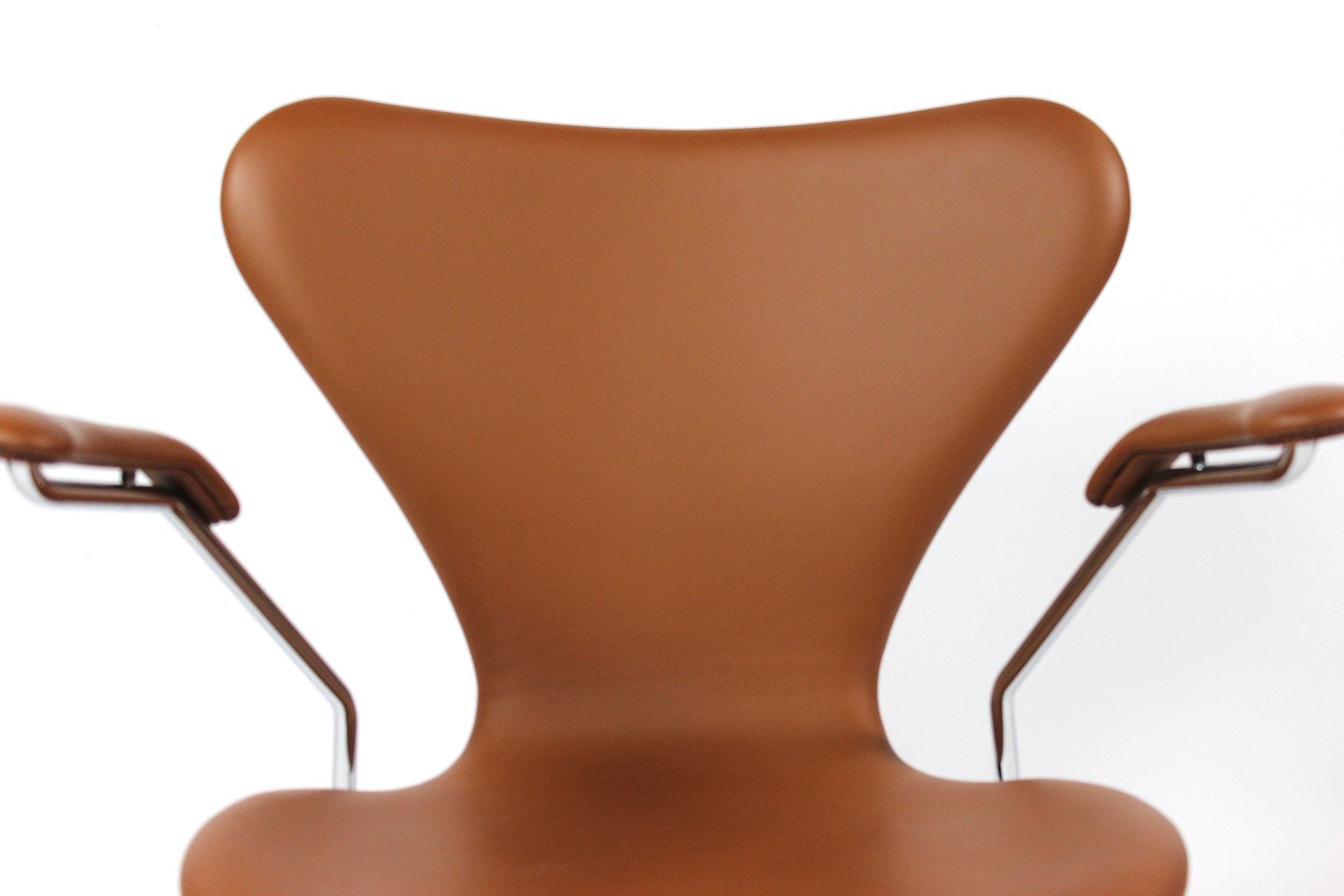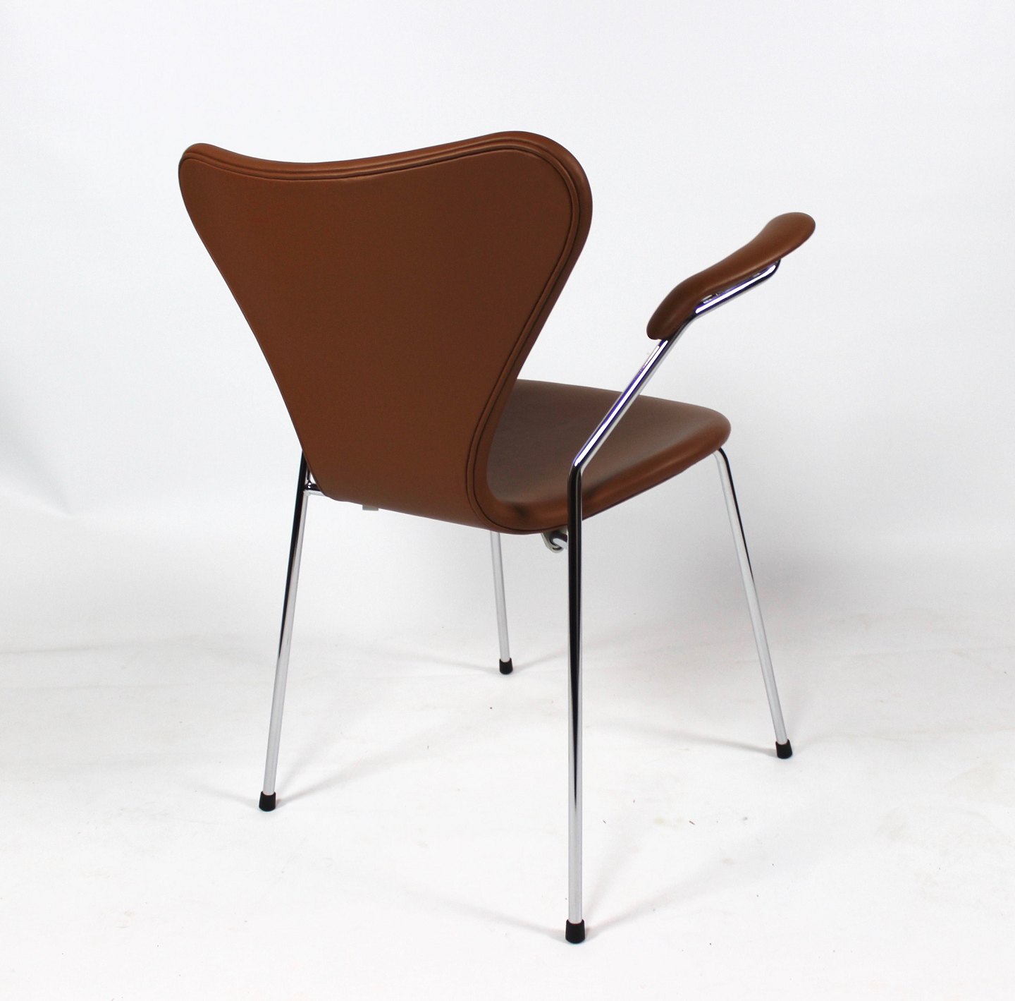 Dette sæt af Syver stole, model 3207, er et tidløst og ikonisk udtryk for dansk design, designet af den legendariske Arne Jacobsen i 1955 og fremstillet af Fritz Hansen i 2019. Stolene er udført i cognacfarvet læder og har elegante armlæn, der tilføjer både stil og komfort til deres design.