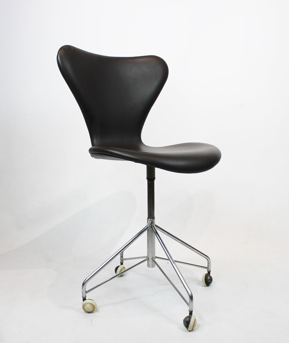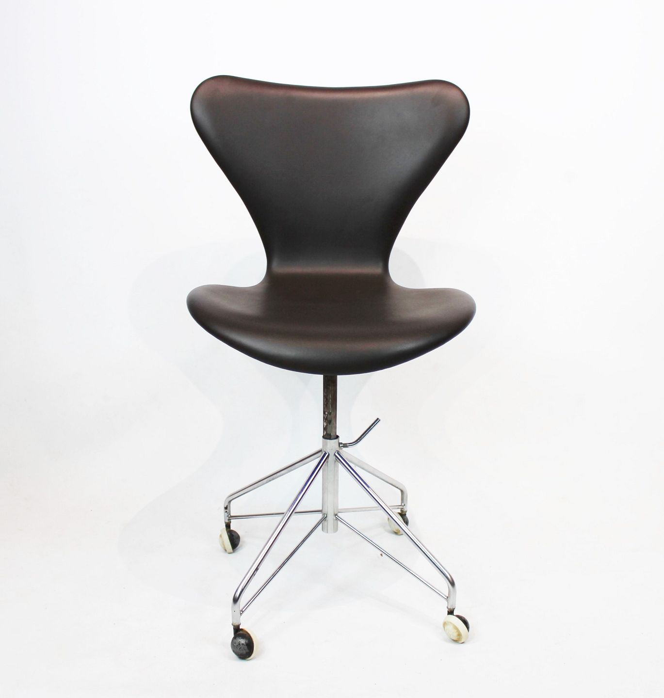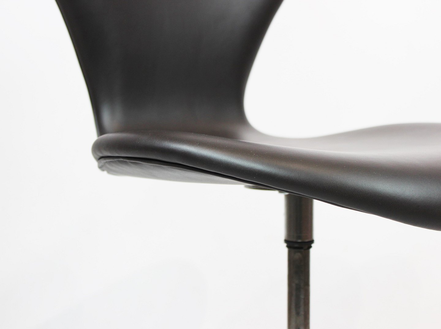 Series Seven office chair, model 3117, without armrests and with swivel function designed by Arne Jacobsen and manufactured by Fritz Hansen in the 1950s. The chair is newly upholstered with dark brown savannah leather.