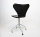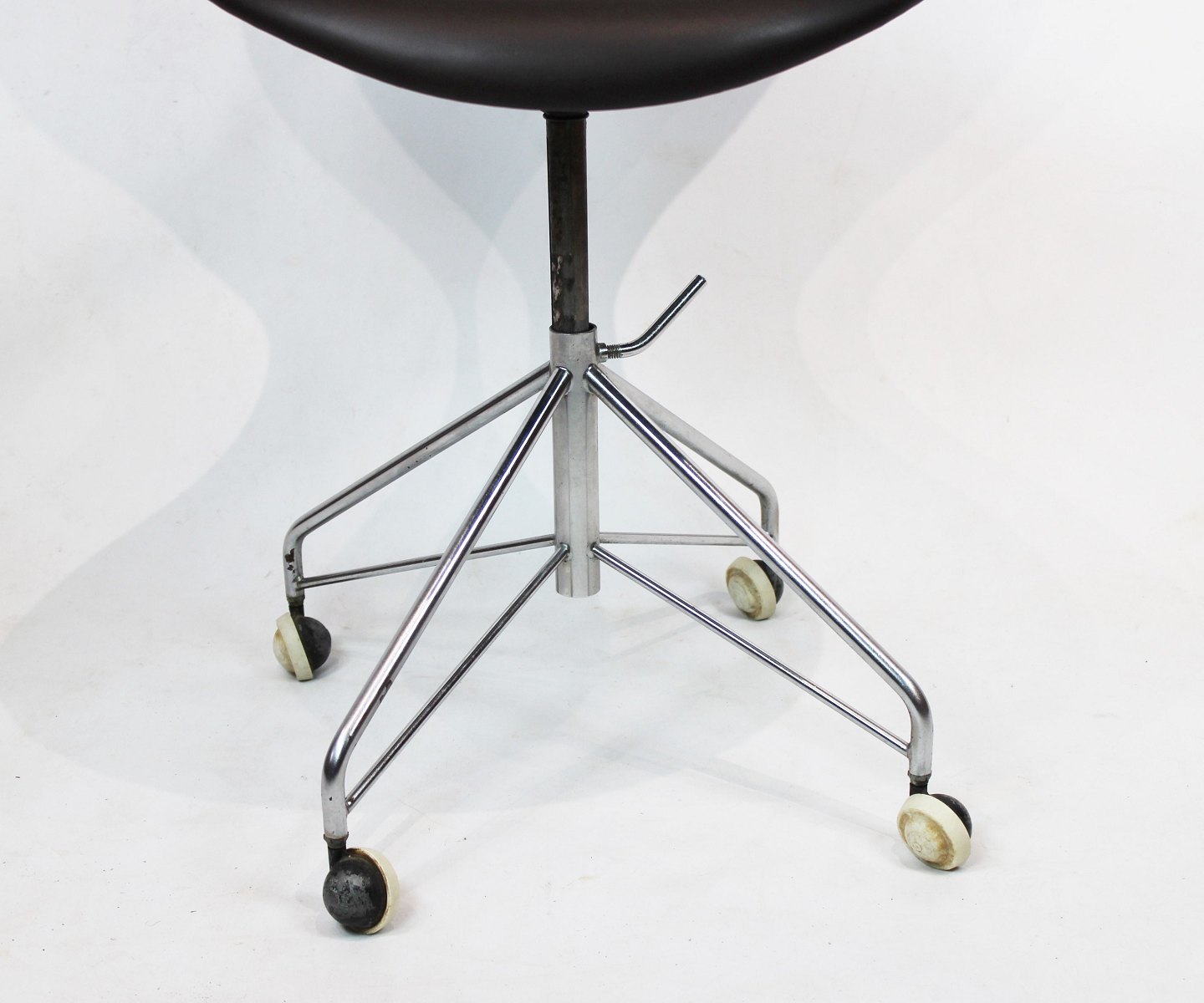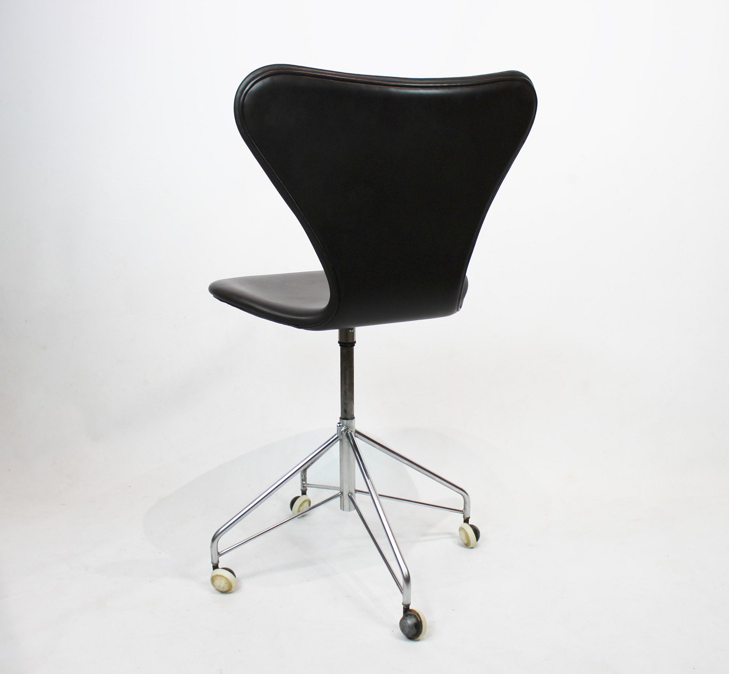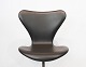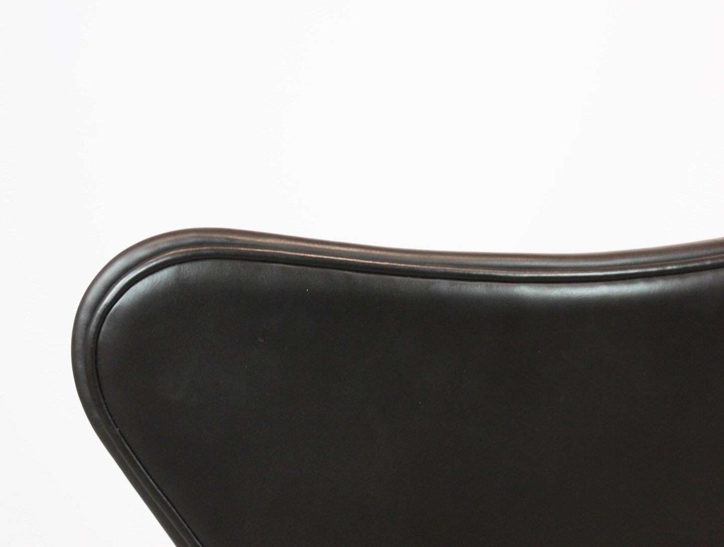 Series Seven office chair, model 3117, without armrests and with swivel function designed by Arne Jacobsen and manufactured by Fritz Hansen in the 1950s. The chair is newly upholstered with dark brown savannah leather.