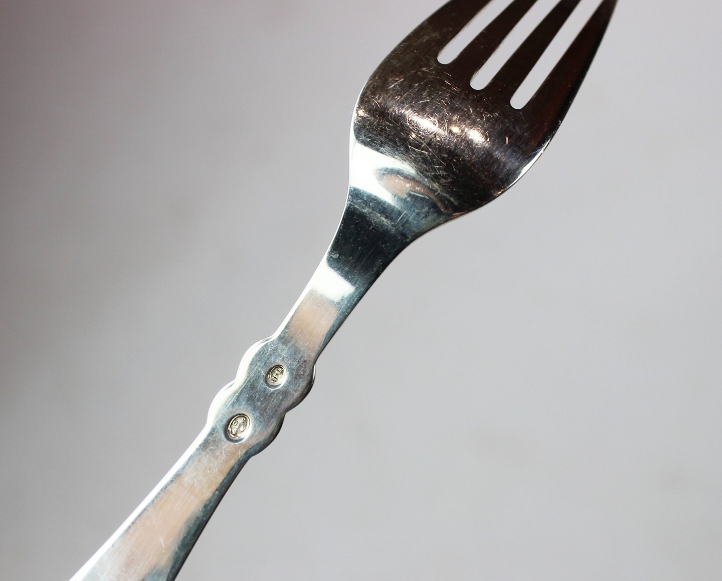 View the price in the text descriptionDinner (450 DKK), lunch (400 DKK) and children's fork (375 DKK) in Rex, hallmarked silver. Ask for number in stock.