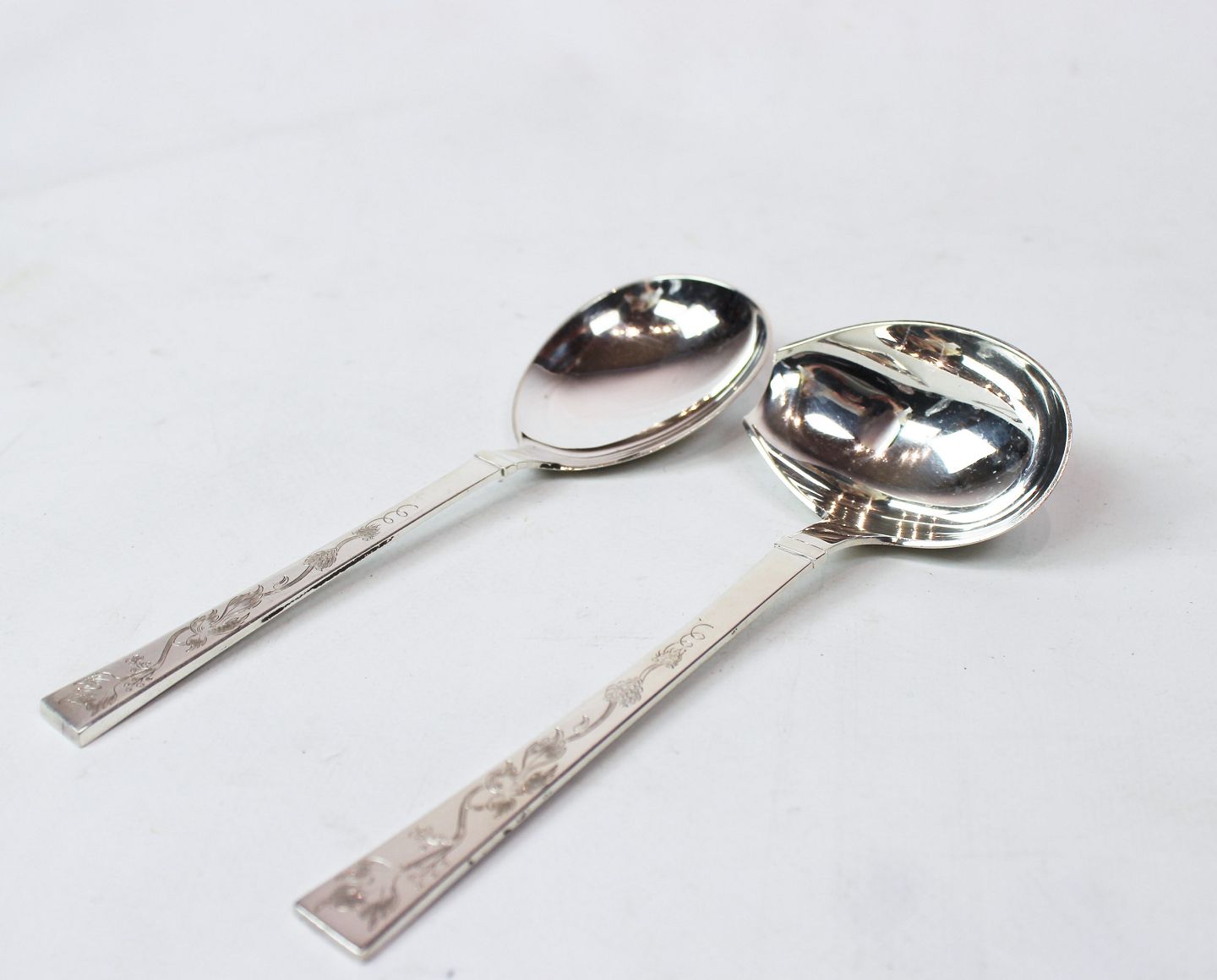 Se prisen i varebeskrivelsenServeringsske (1.300 DKK) og sovseske (1.350 DKK) i arvesølv nr. 12 af Hans Hansen.