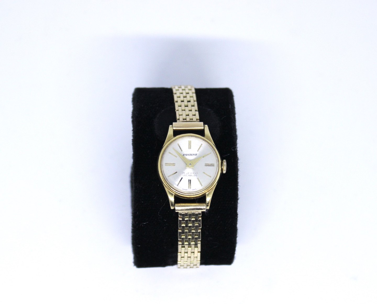 Candino wrist watch, case of 18 ct. gold and chain with 7 rows of 14 ct. gold. The watch is swiss made and chain is stamped SEJ.