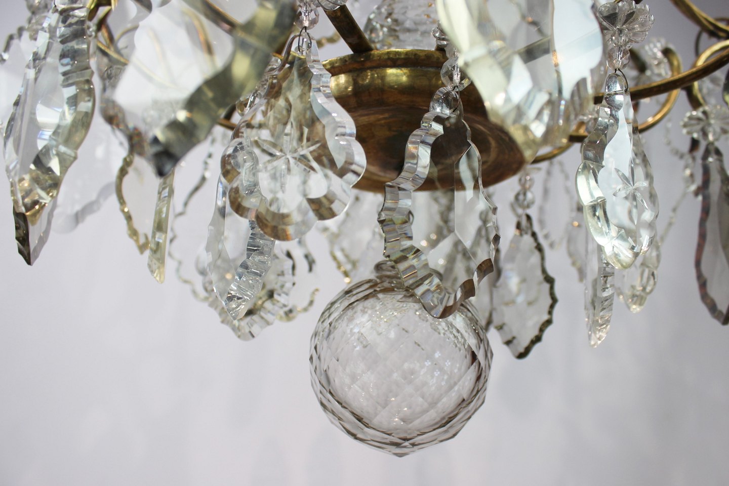 SoldChandelier of brass and polished prisms from France around the 1920s. The chandelier is in great antique condition.