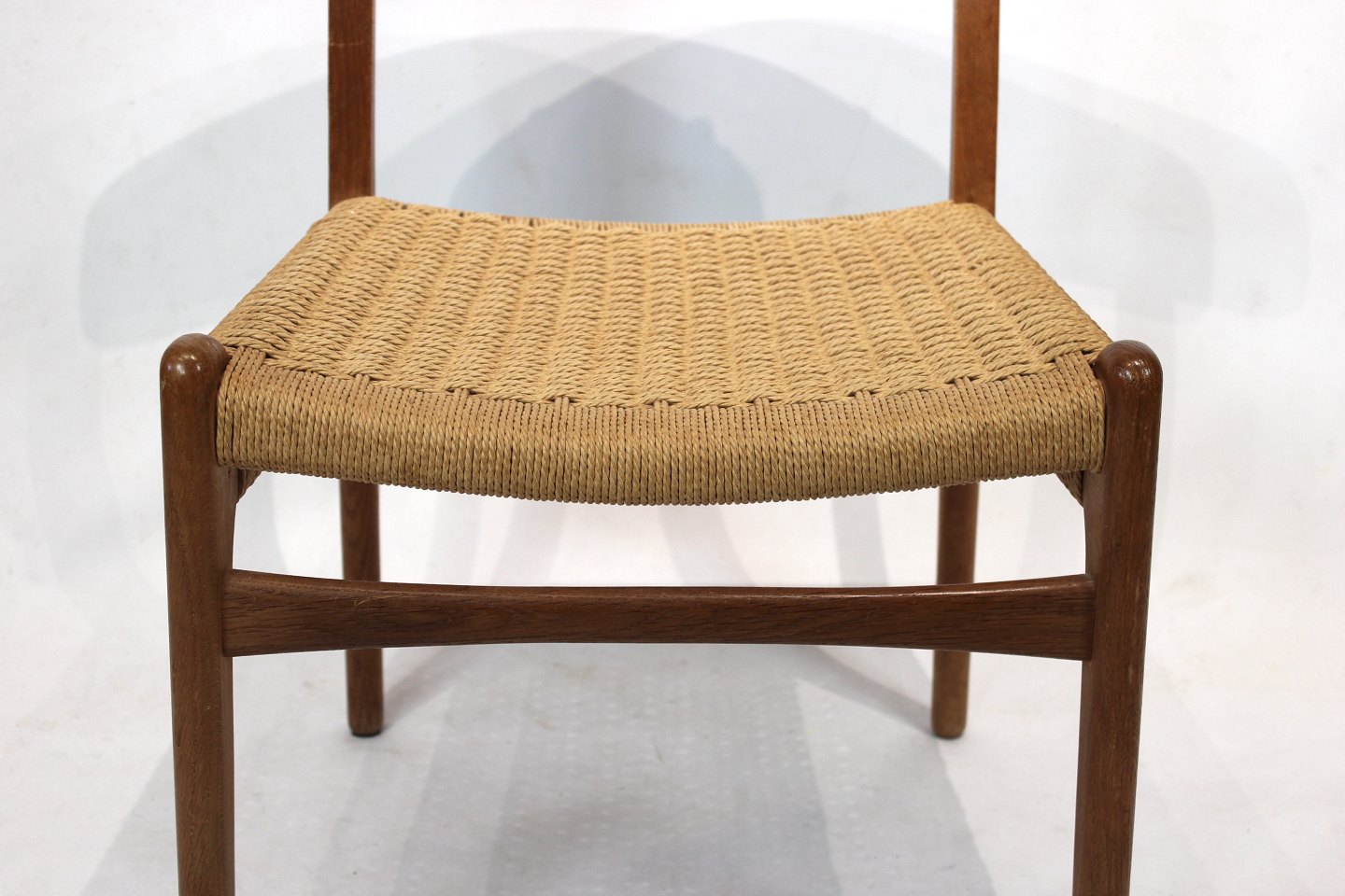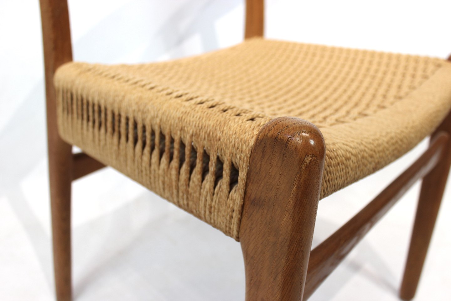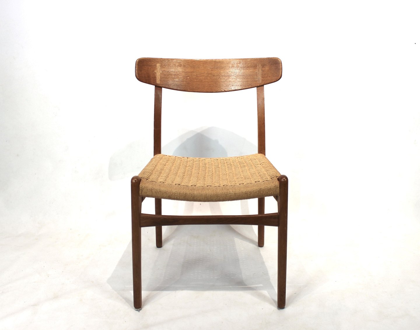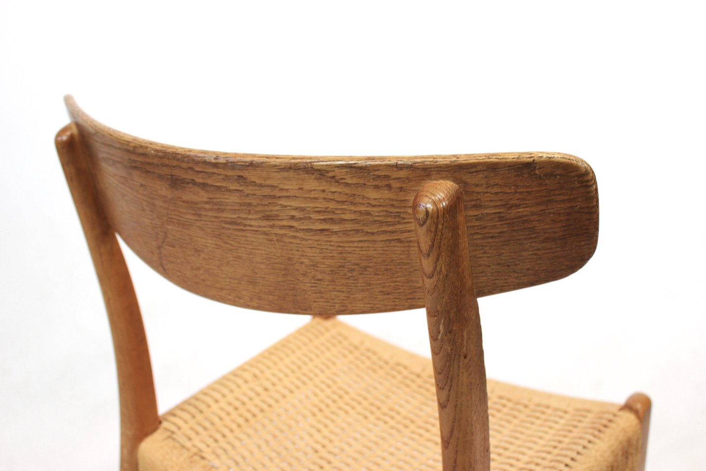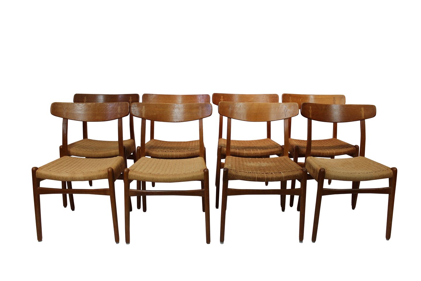 SolgtSæt af 8 CH23 spisestuestole designet af Hans Wegner og fremstillet af Carl Hansen og søn i 1950erne. Stolene er af eg, med sæder af papirflet og alle i flot brugt stand.