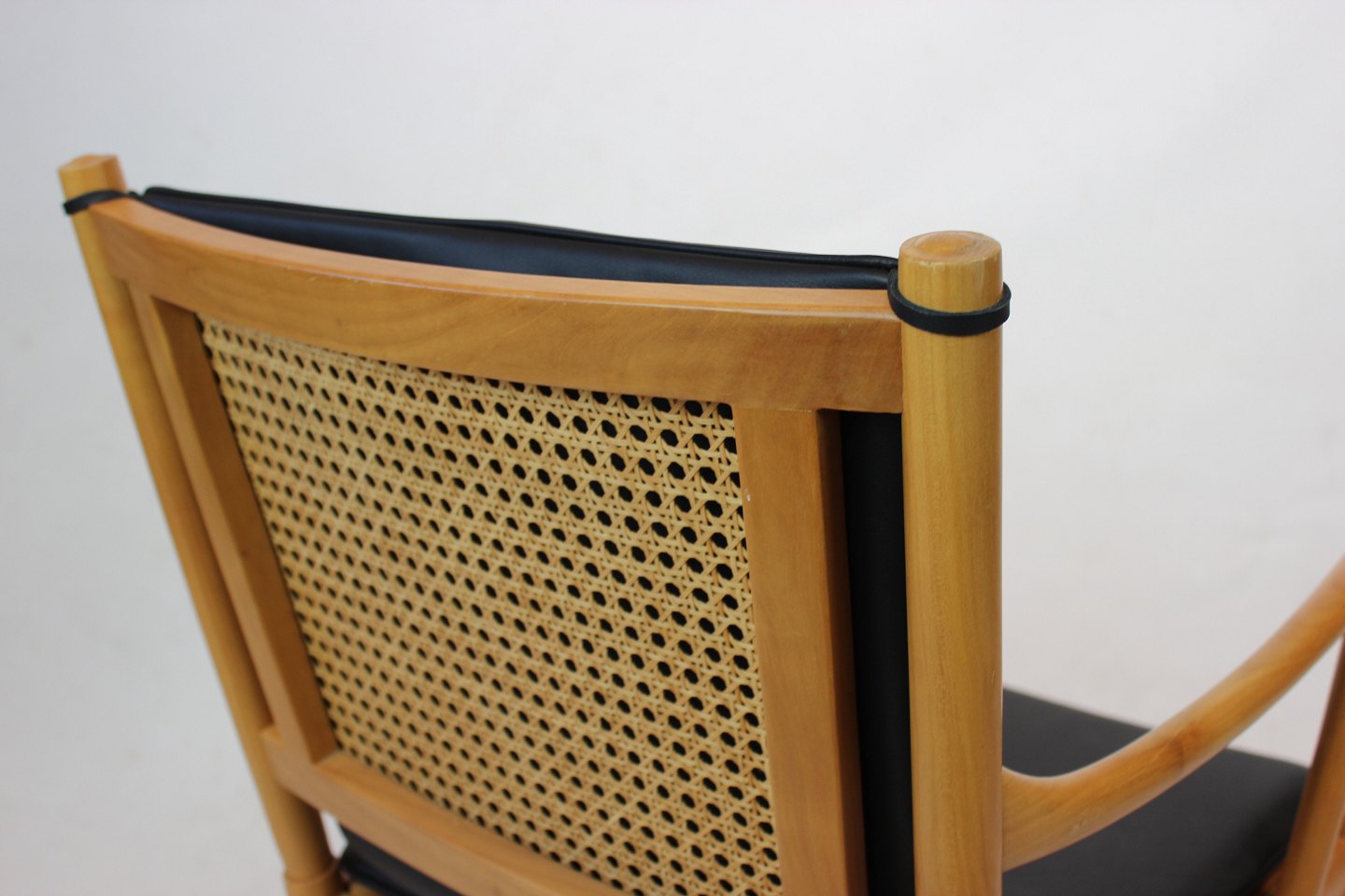 Ole Wanscher er kendt for sin evne til at kombinere klassisk elegance med funktionel enkelhed, og model PJ-301 er ingen undtagelse. Stolen har en tidløs æstetik med rene linjer og en behagelig siddekomfort, der gør den velegnet til både stuer og kontorer. Kirsebærtræets rige farve og fine åremønstre komplementerer det sorte læder perfekt, hvilket resulterer i en harmonisk og stilfuld stol.