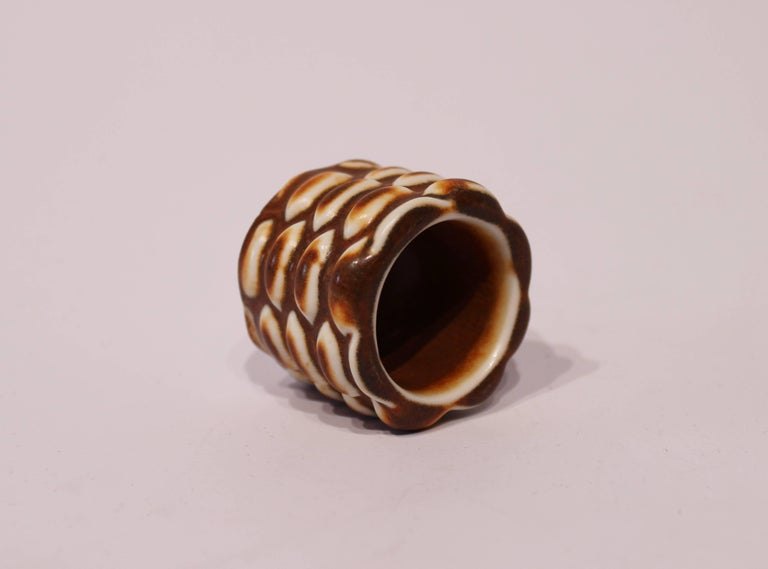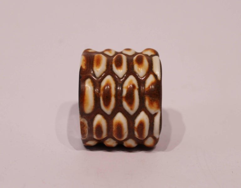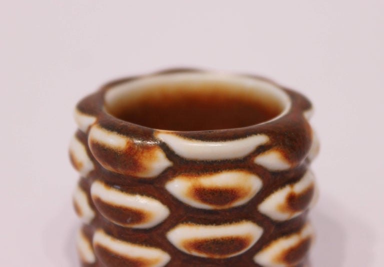 Vi køberDette keramik saltkar, designet af Axel Salto for Royal Copenhagen i 1950'erne, er et smukt eksempel på mid-century dansk keramik. Saltkaret er dekoreret i lyse og mørke brune nuancer, hvilket fremhæver Saltos karakteristiske stil og ekspertise i at skabe teksturerede og organiske former.