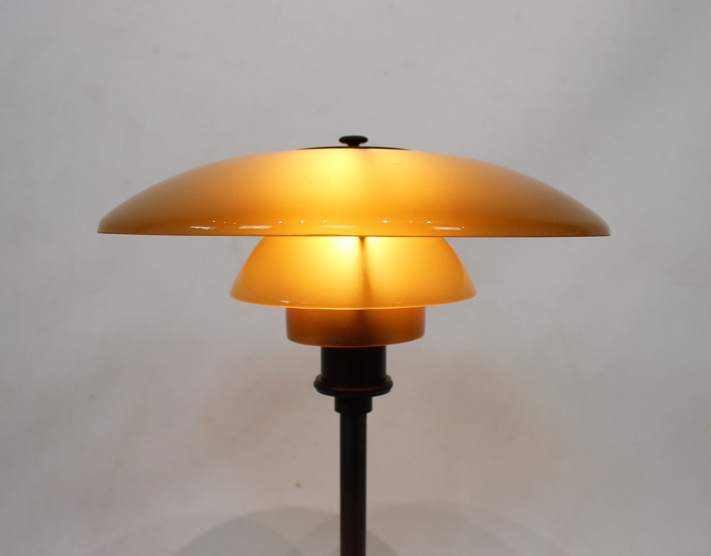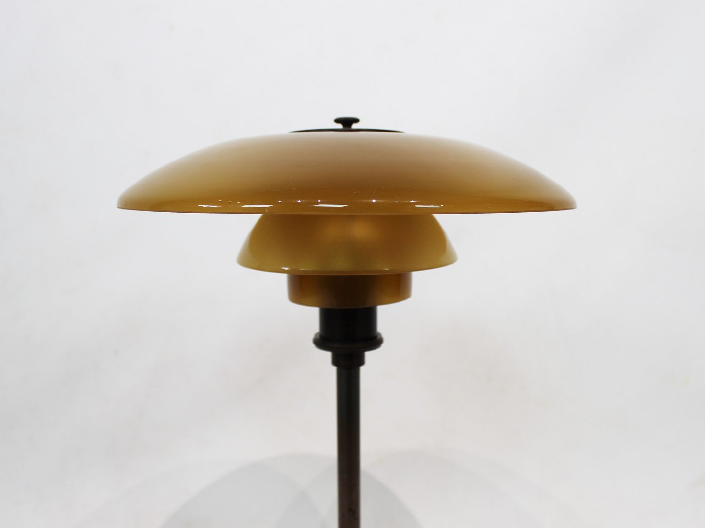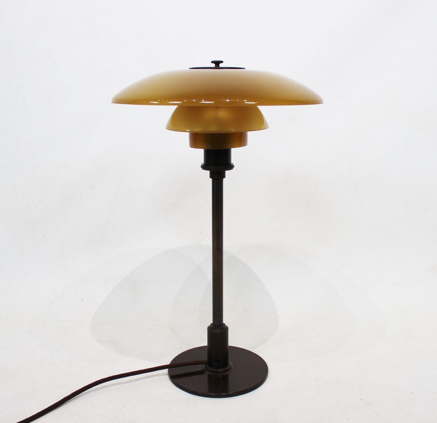 SolgtPH 3/2 bordlampe med skærme af rav farvet glas og stel af bruneret messing, designet af Poul Henningsen og fremstillet af Louis Poulsen i starten af 1930erne. Lampen er i flot brugt stand.