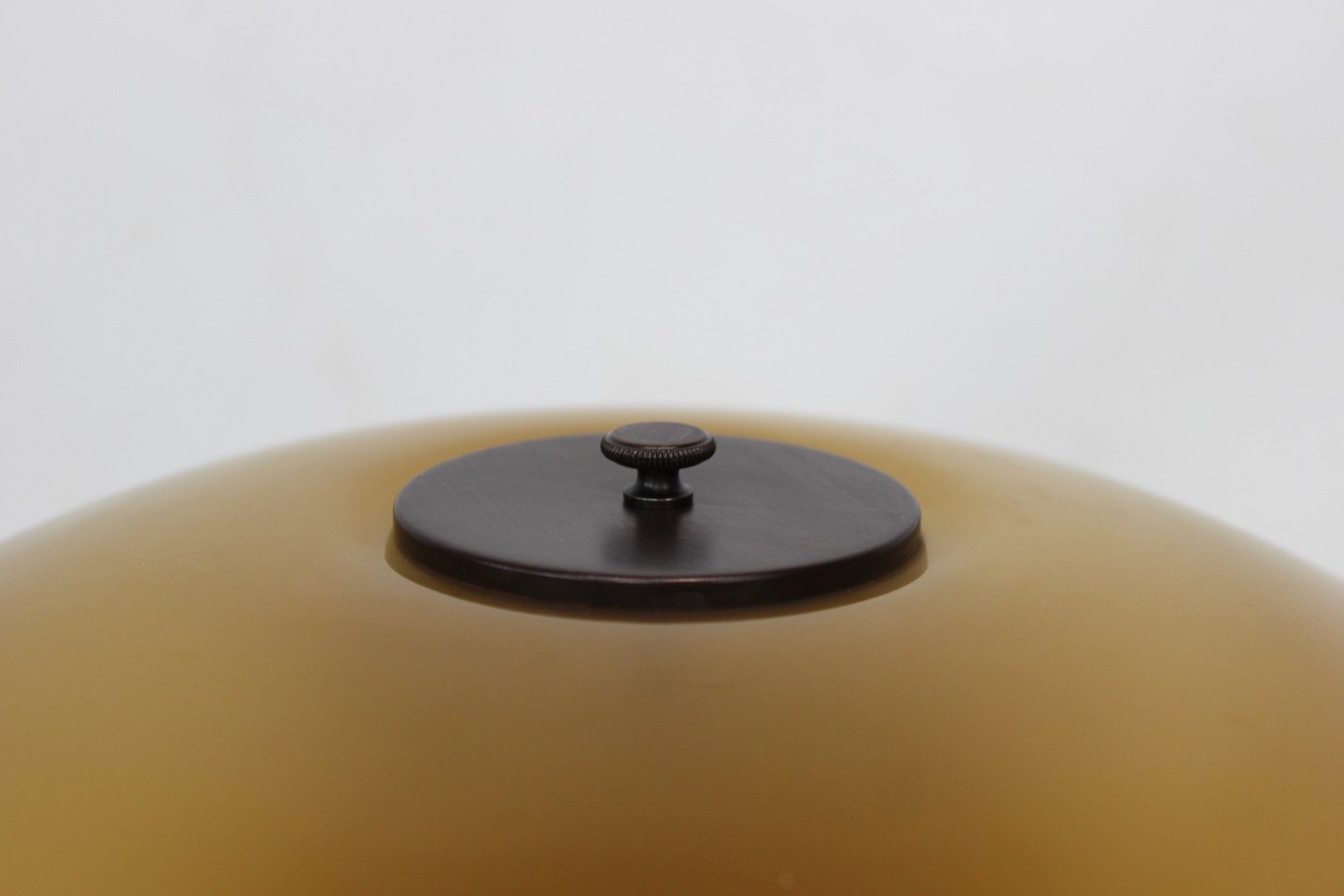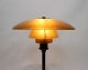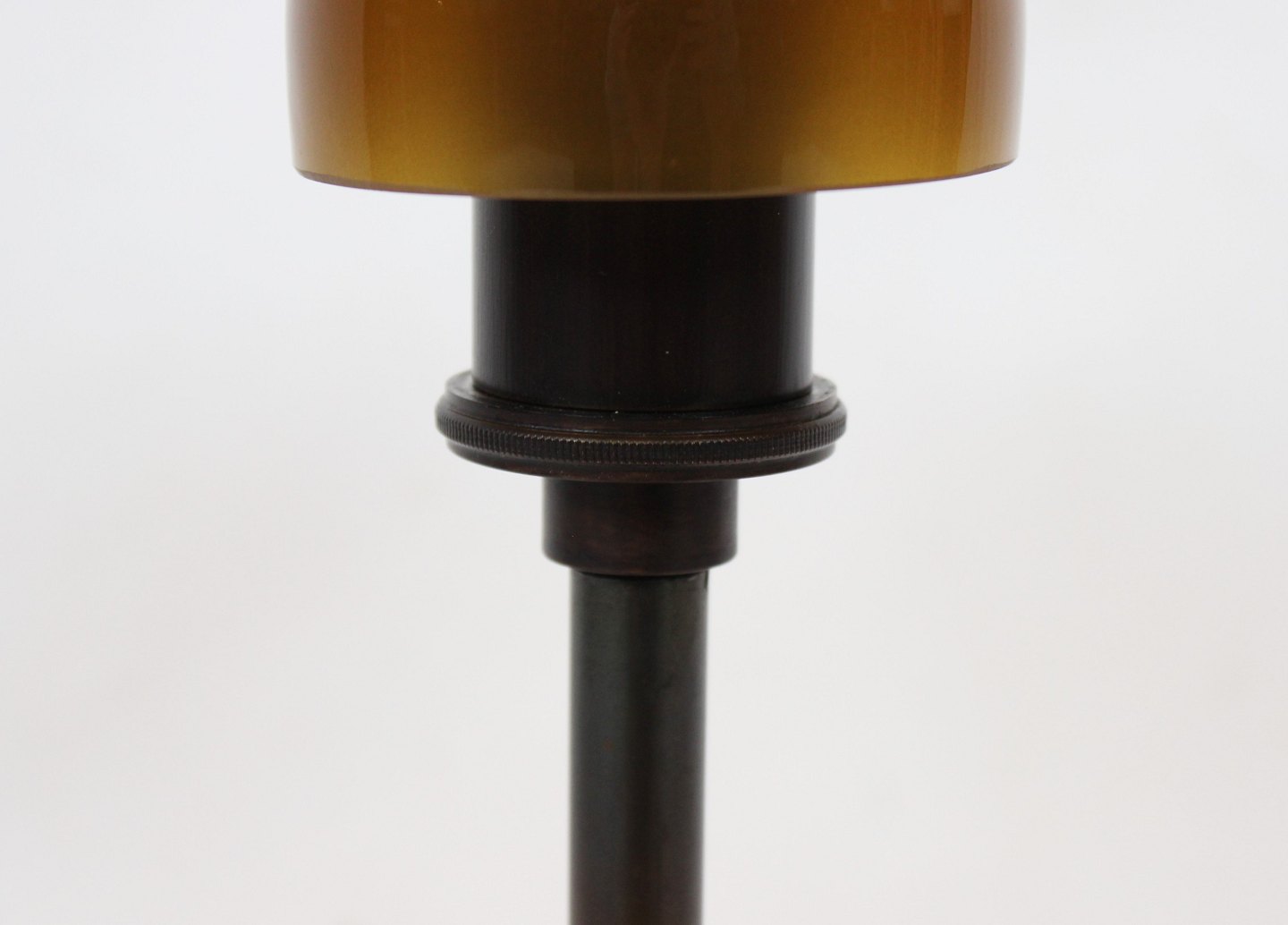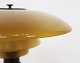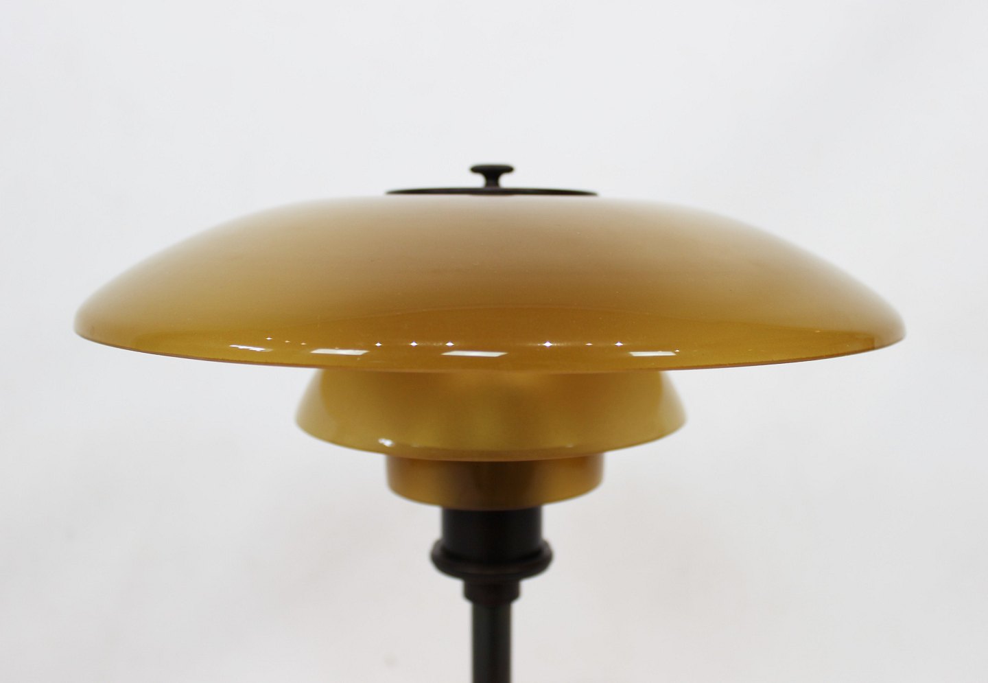 SolgtPH 3/2 bordlampe med skærme af rav farvet glas og stel af bruneret messing, designet af Poul Henningsen og fremstillet af Louis Poulsen i starten af 1930erne. Lampen er i flot brugt stand.