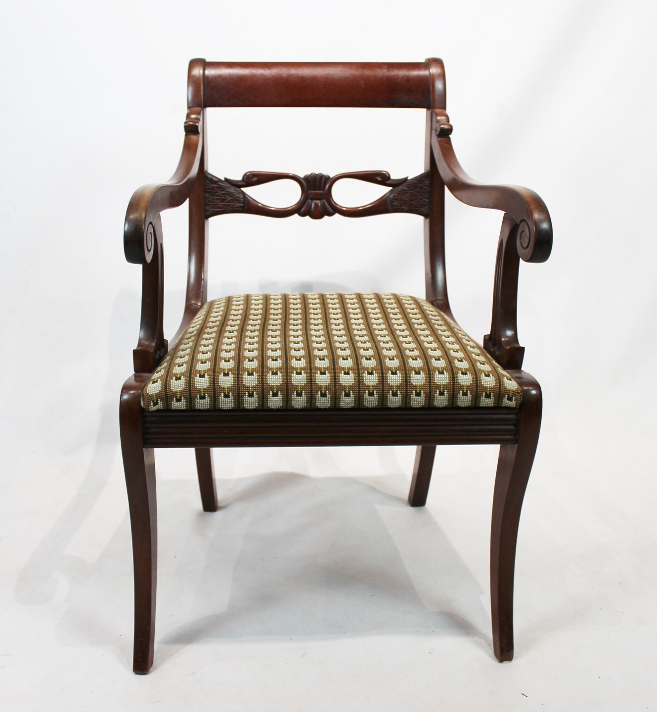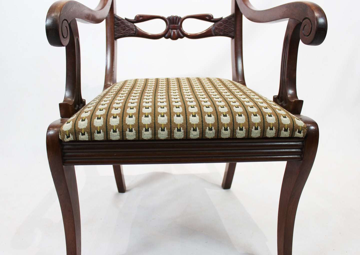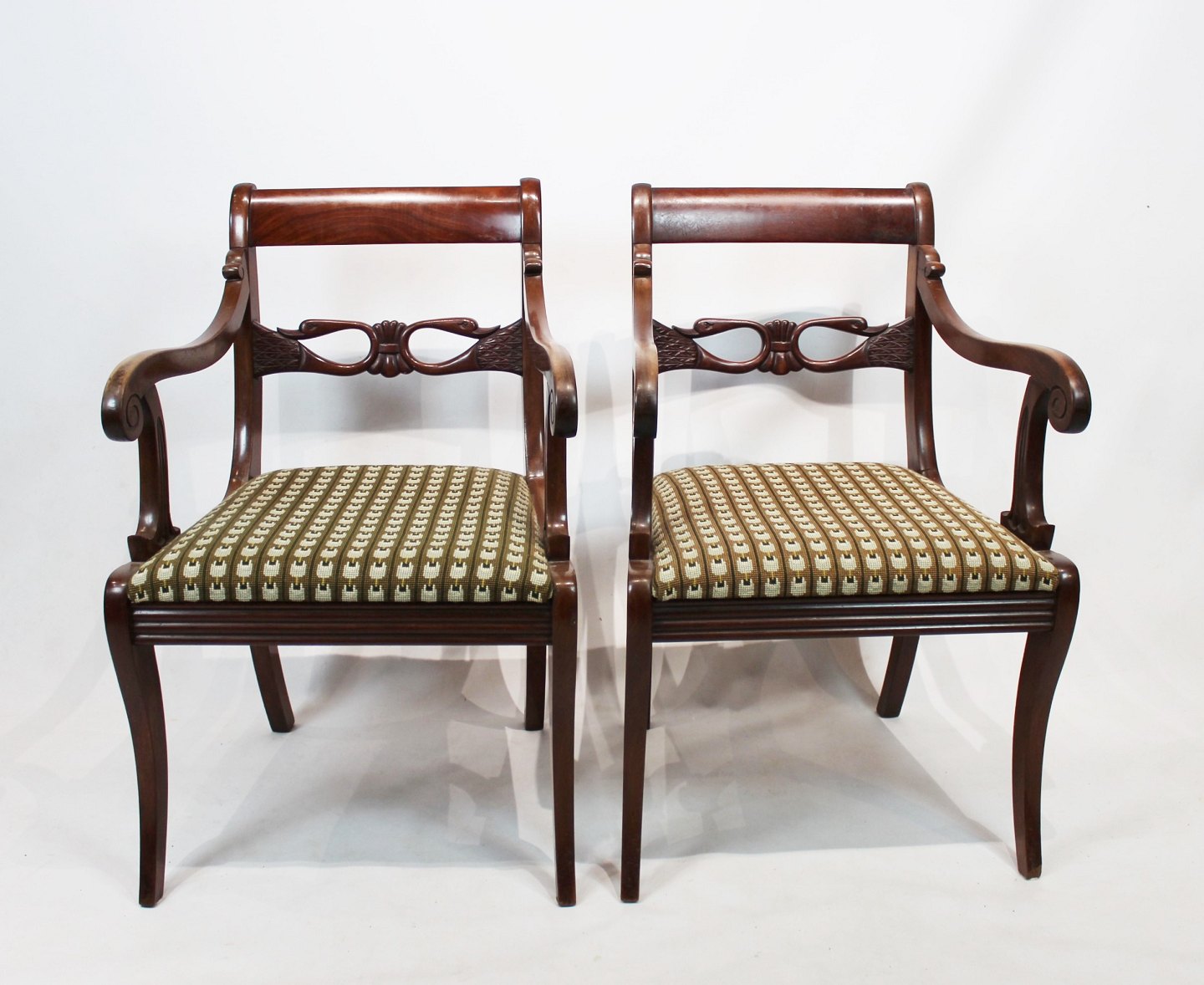Et par armstole i Sen Empire af mahogni og polstret med mørke grønt stof fra 1860erne. Stolene er i flot antik stand.