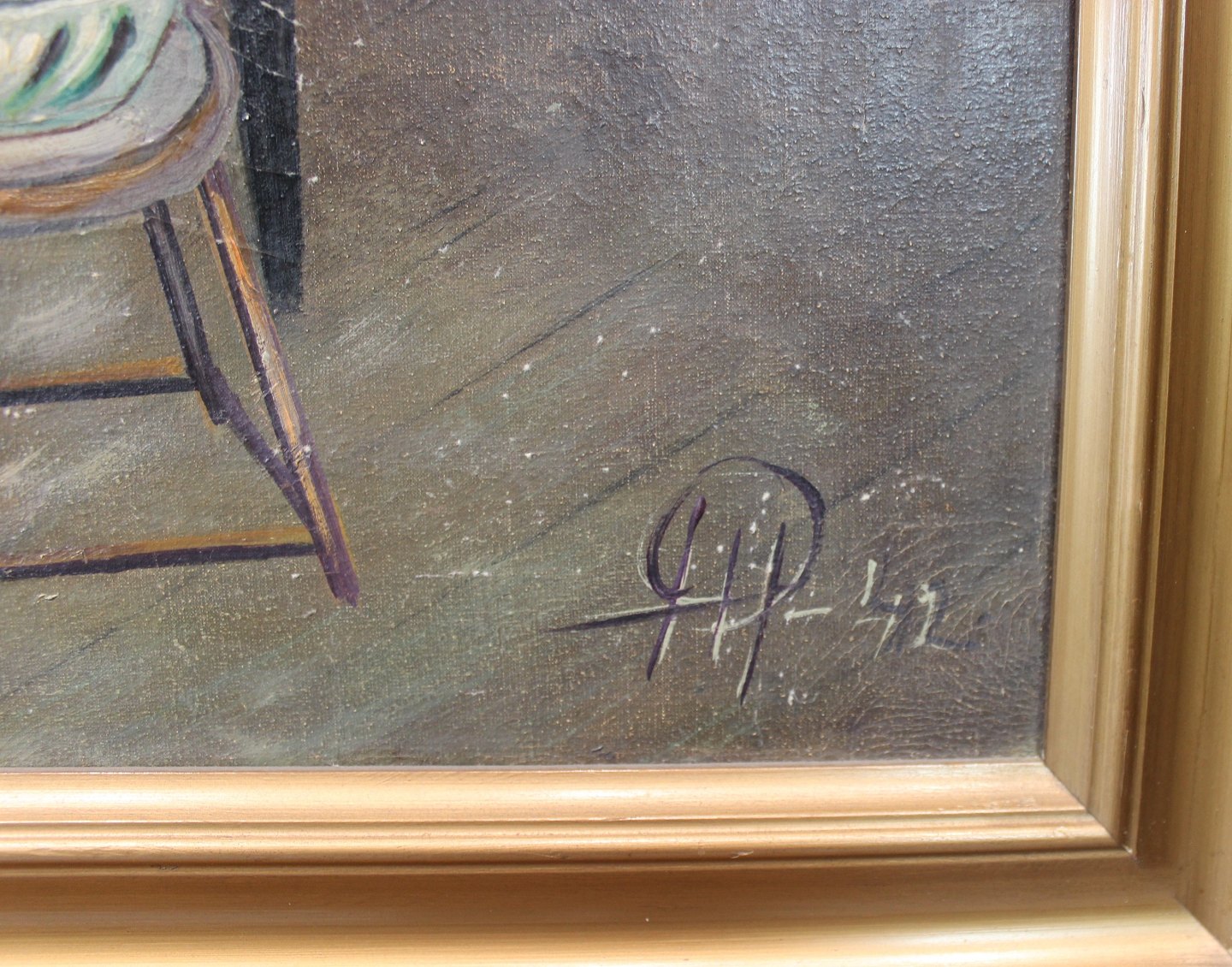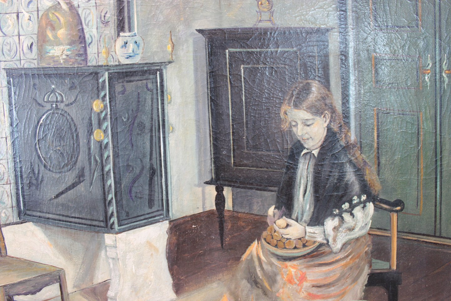 Maleri med motiv af bondepige og guldramme signeret H.P. fra 1942. Maleriet er i flot brugt stand.