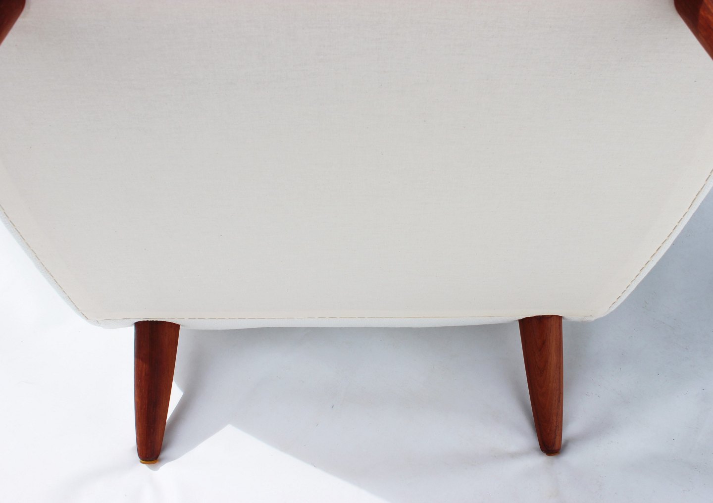 The armchair with a low back, upholstered in an elegant white fabric and resting on beautifully polished rosewood legs, is a masterpiece of Danish design from the 1960s. Its clean lines and organic form reflect the period aesthetics of Scandinavian furniture design.