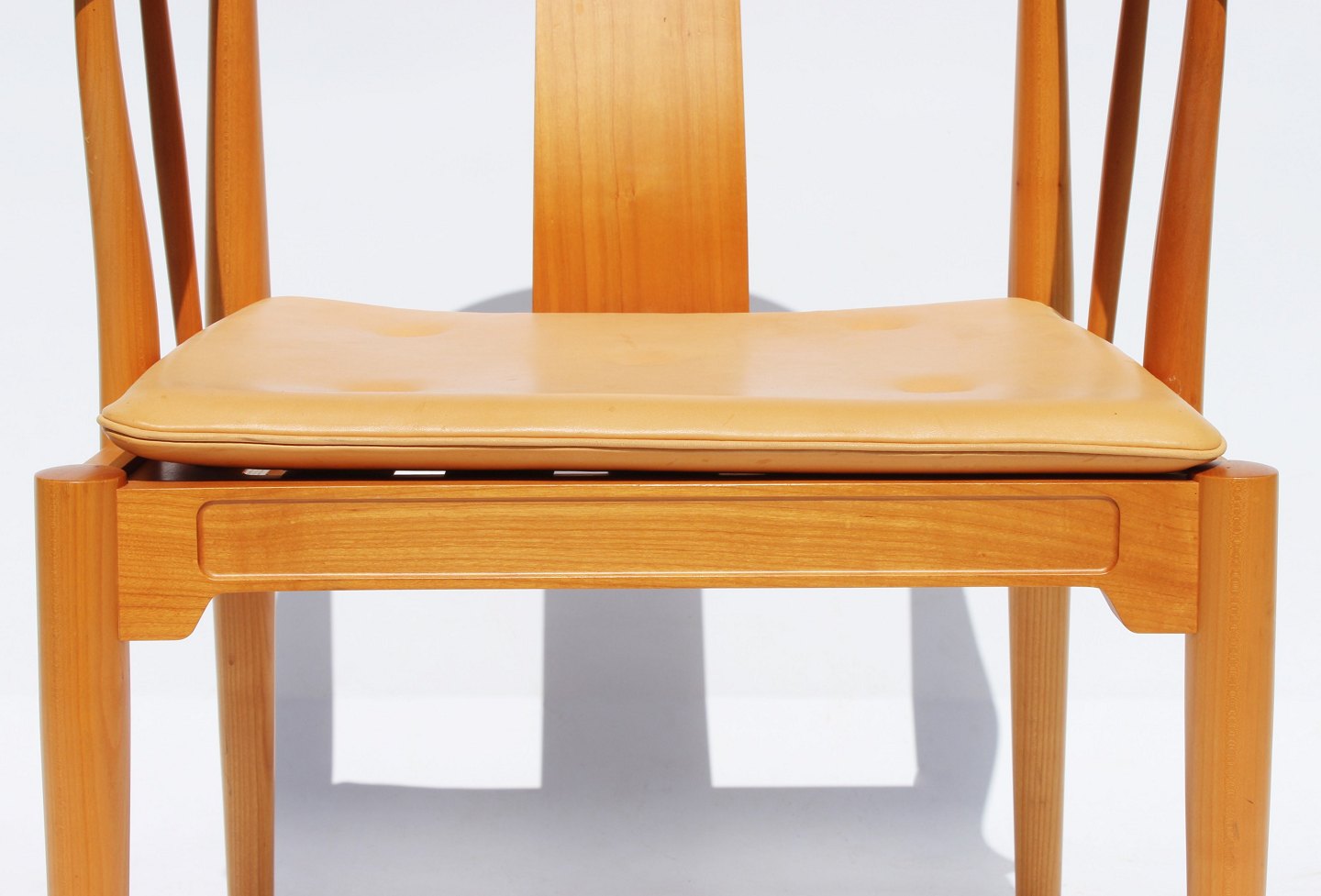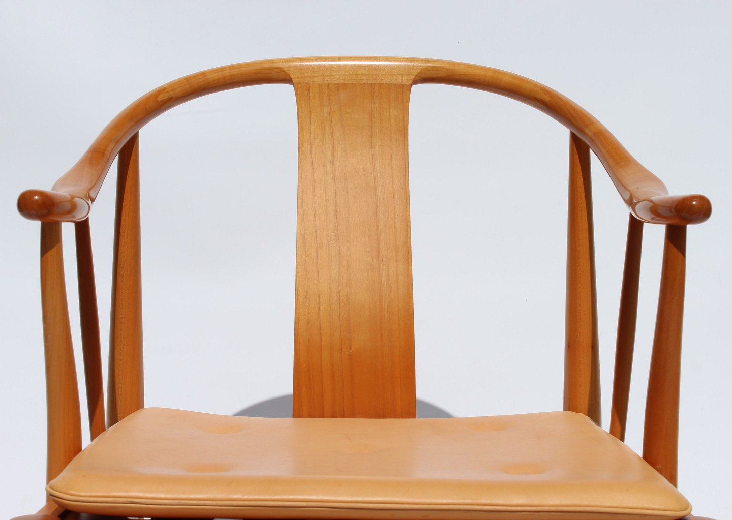 Et sæt af fire Kina stole, model 4283, designet af Hans J. Wegner i 1944 og fremstillet af Fritz Hansen i 1999. Stolene er af kirsebær og med hynde af natur læder. 2 stk tilbage