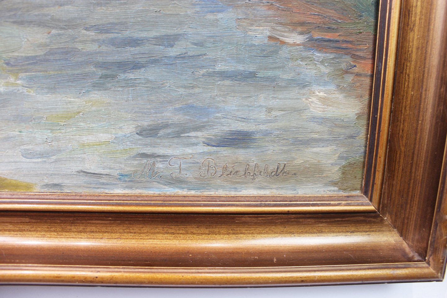 Oliemaleri med motiv af dansk landskab med forgyldt ramme signeret M. T. Blichfeldt.