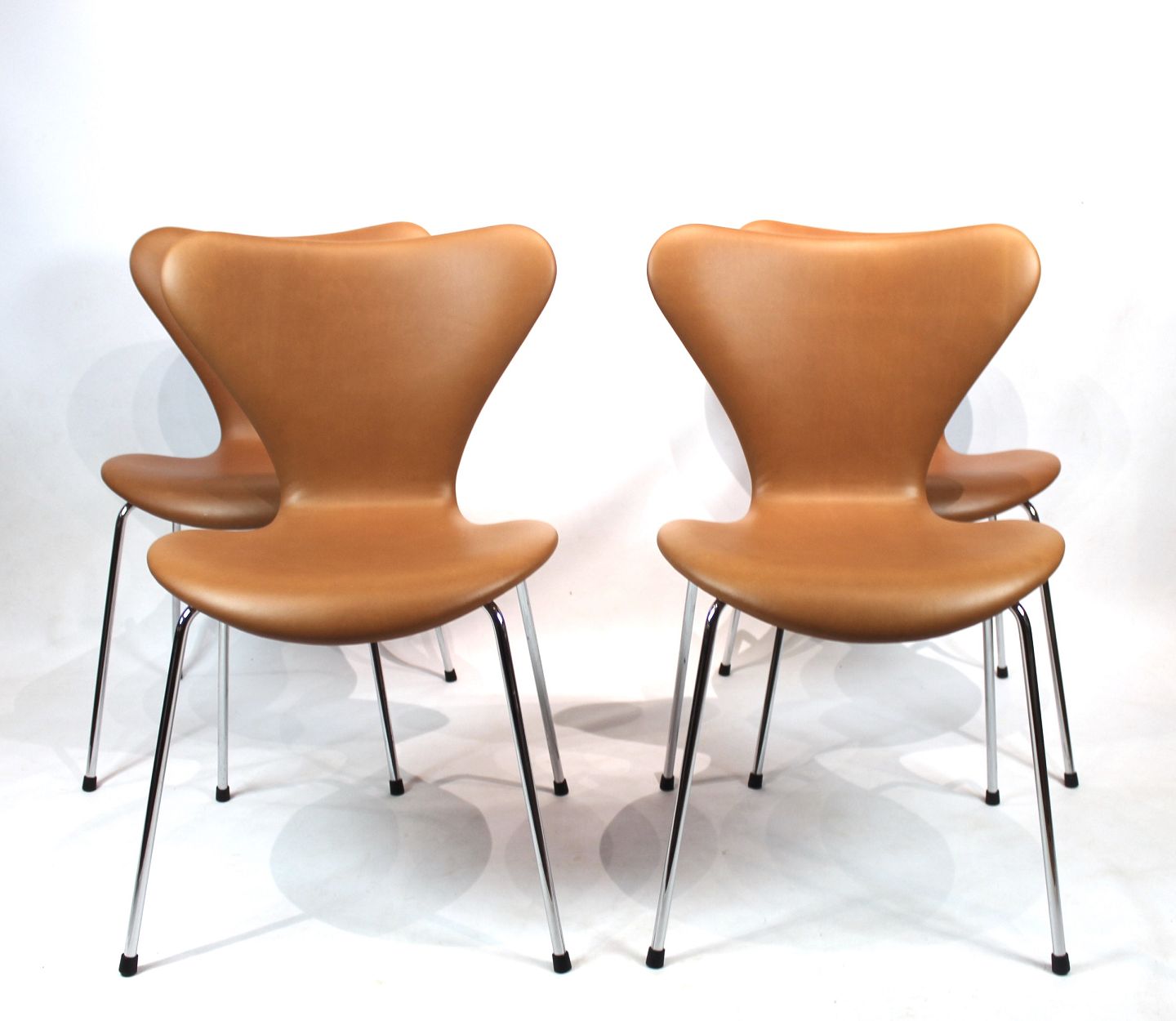 Dette sæt på fire Syver stole, også kendt som model 3107, er et fremragende eksempel på tidløst dansk design, skabt af den legendariske designer Arne Jacobsen og fremstillet af Fritz Hansen.