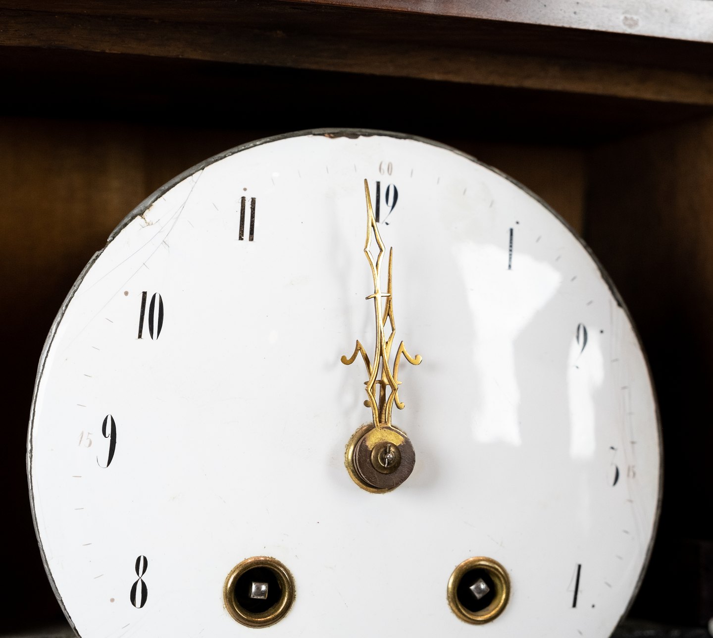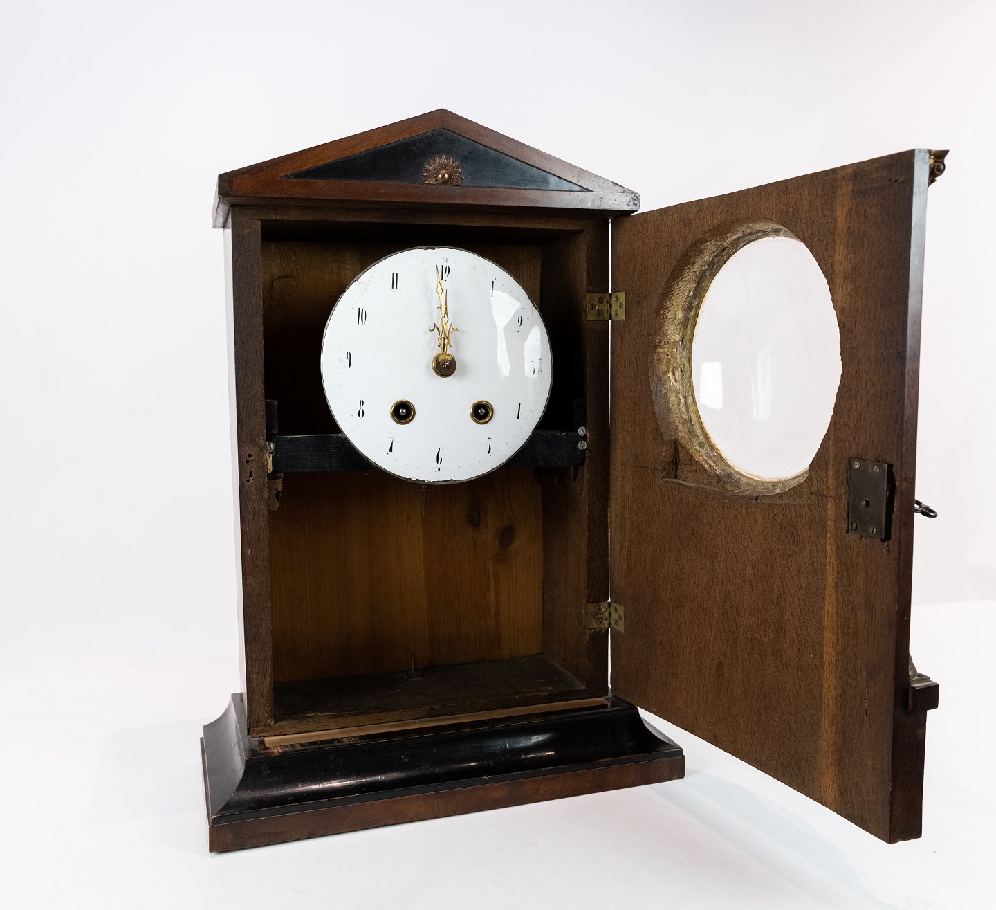 SolgtFransk kamin bord ur i mahogni fra 1840erne. Uret er i flot antik stand.