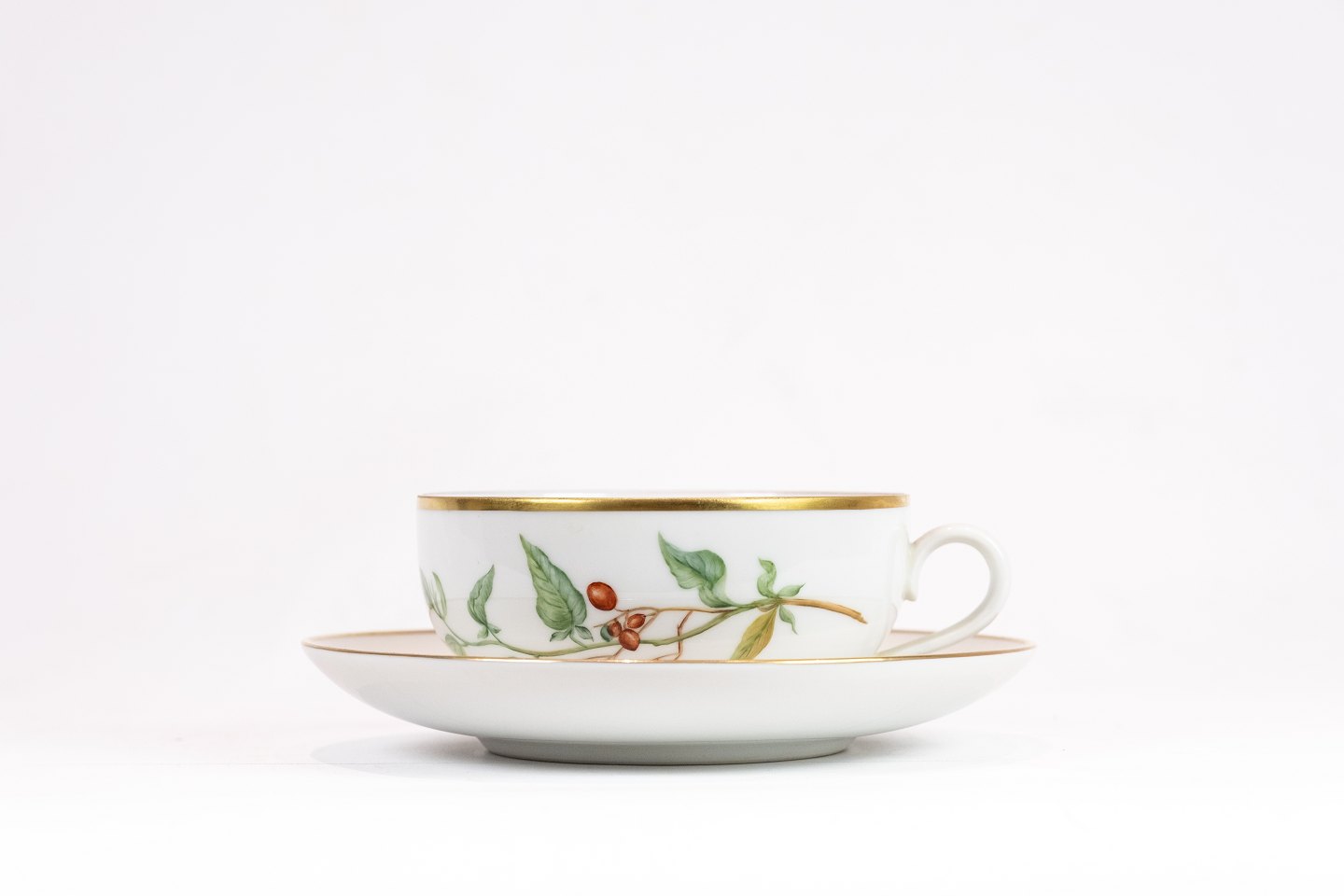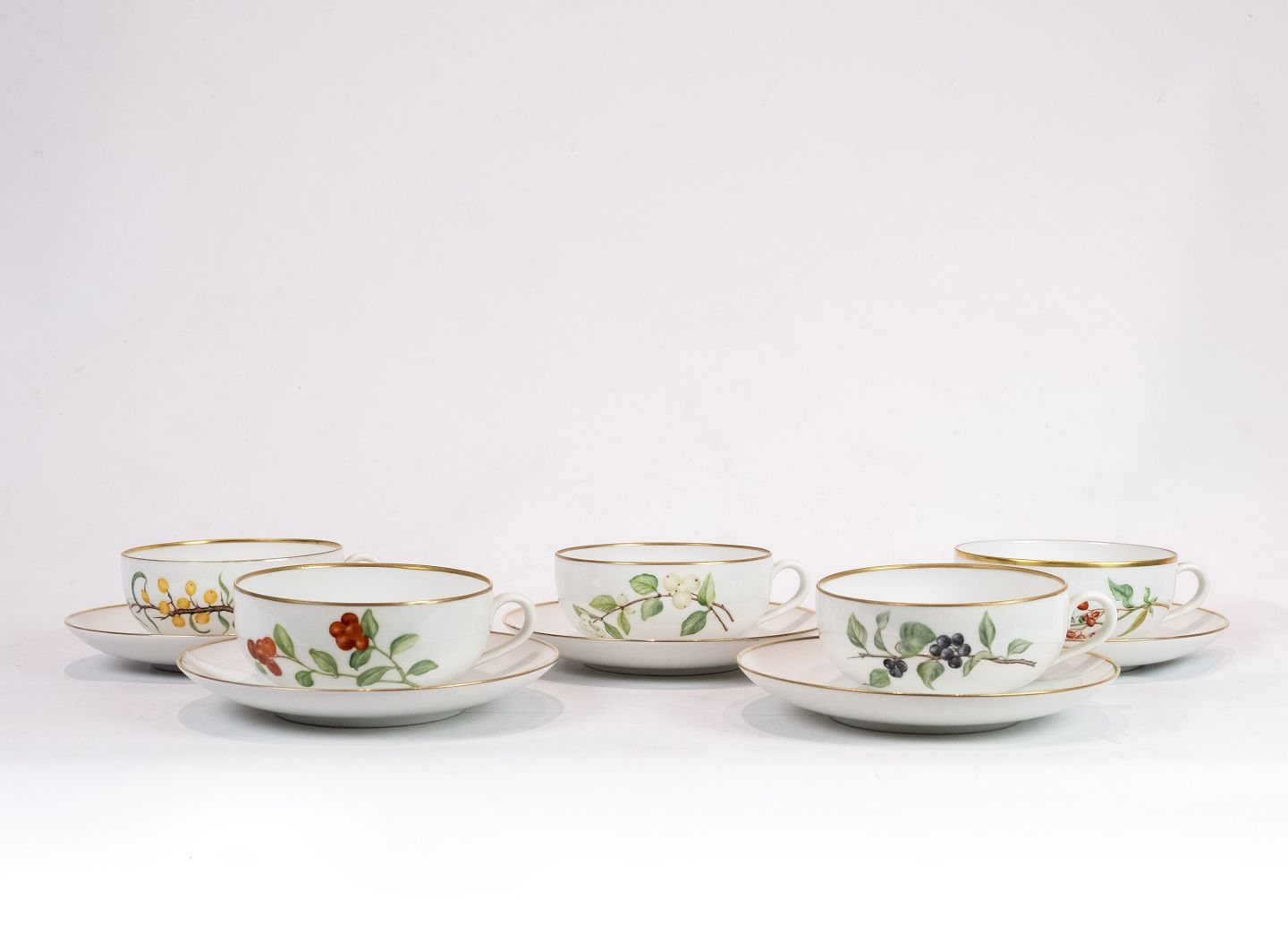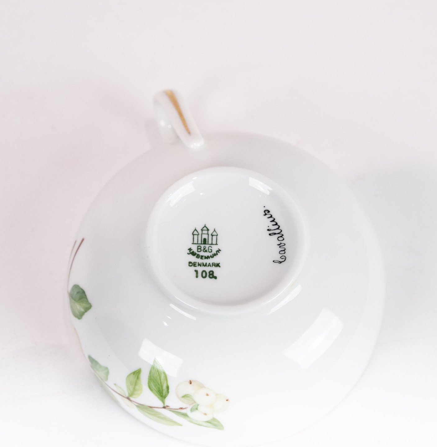 Porcelain tea cups with saucer decorated with different floral motives, no.: 108, by Bing and Grøndahl. Ask for number in stock. Price is per cup/saucer.
