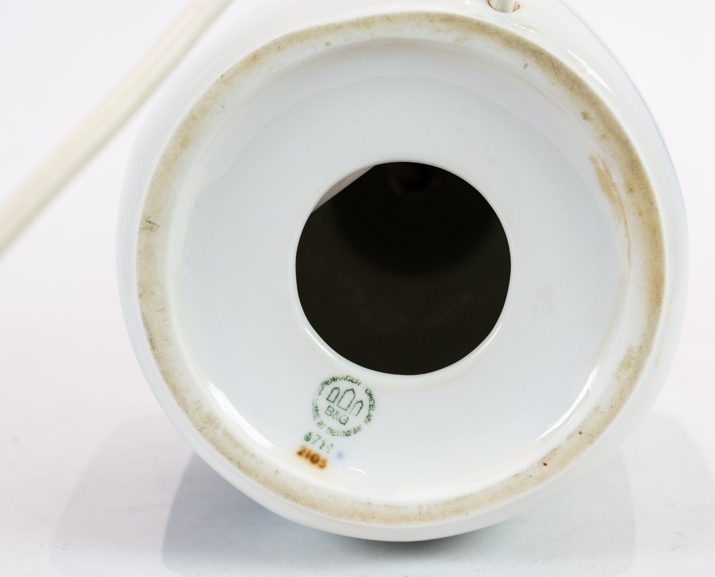 Bordlampe fra B&G dekoreret med blåt mønster. Lampen er fra 1983 - og med nummeret 6714. Skærmen er håndmalet og håndfoldet i papir.
