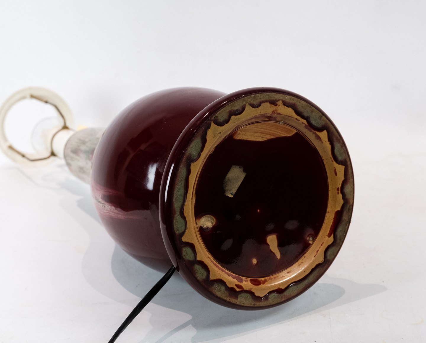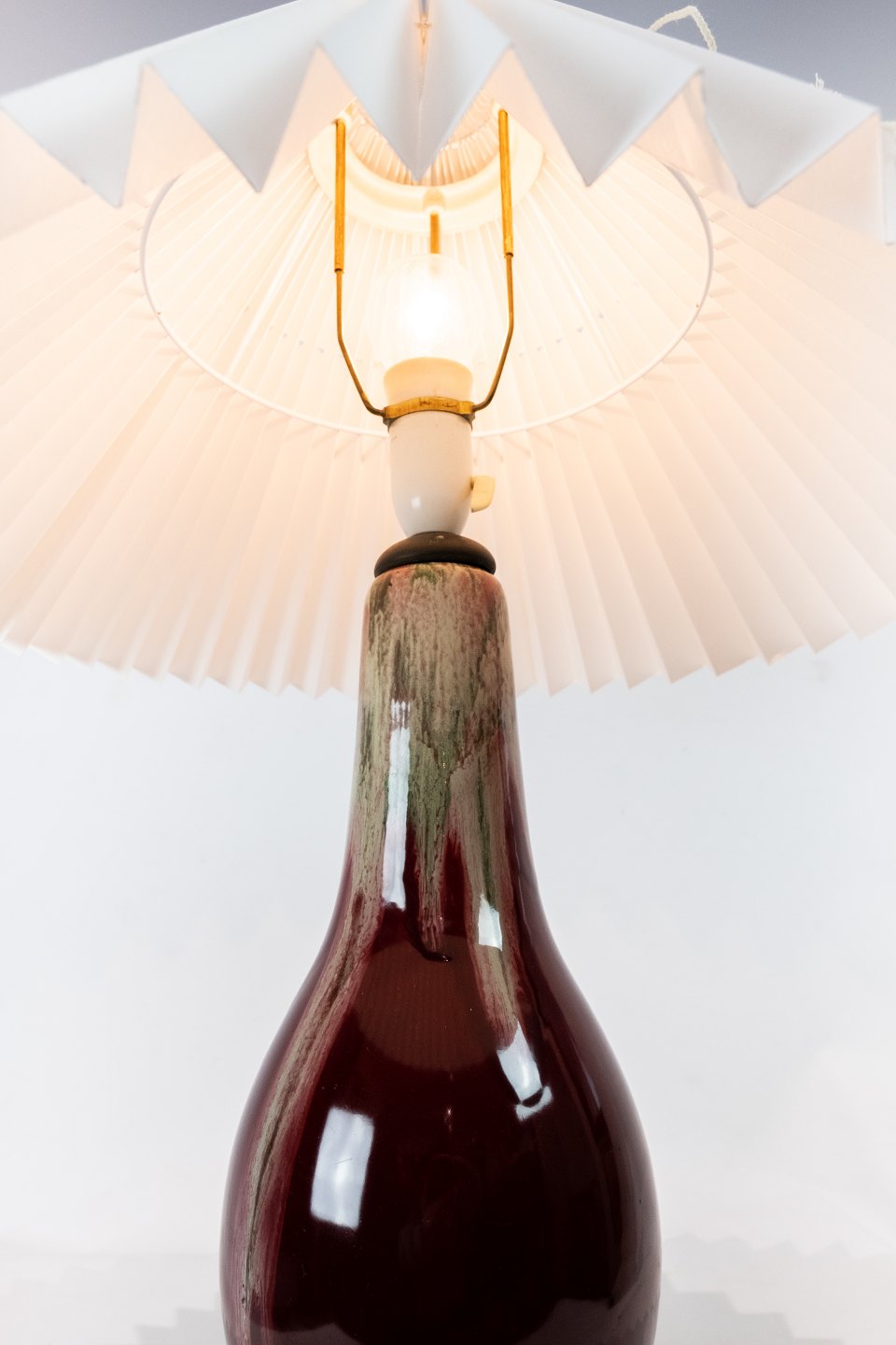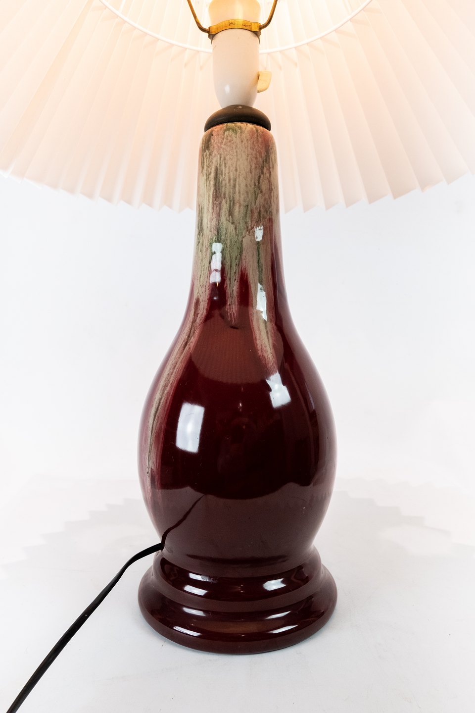 Tischlampe mit dunkelroter Glasur aus Michael Andersens Keramikfabrik auf Bornholm. Der Schirm ist handbemalt und handgefaltet in Papier.