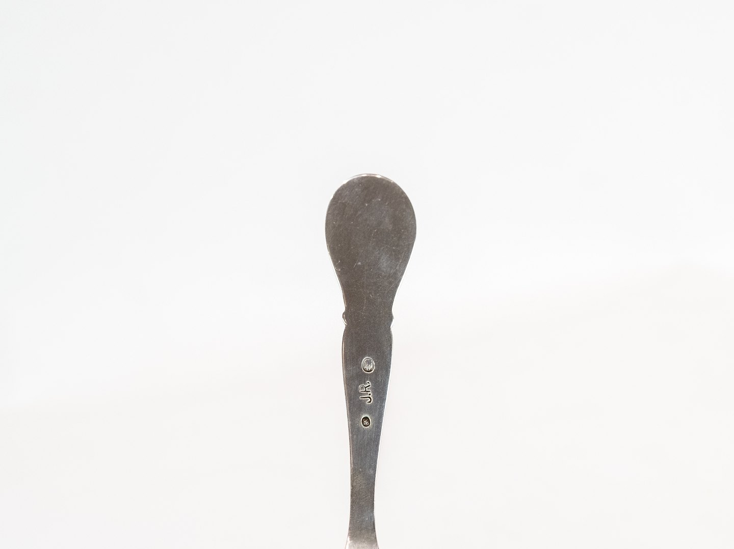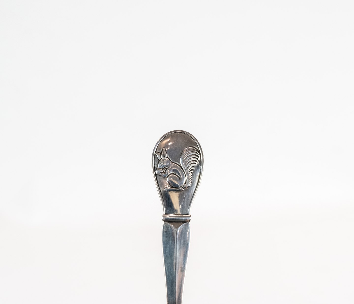 Barnegaffel med motiv af egern i tretårnet sølv.