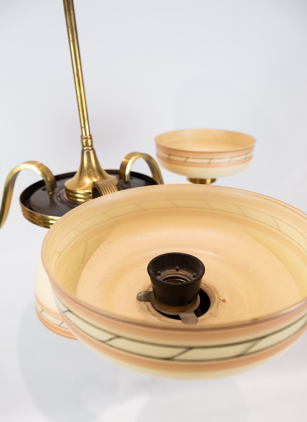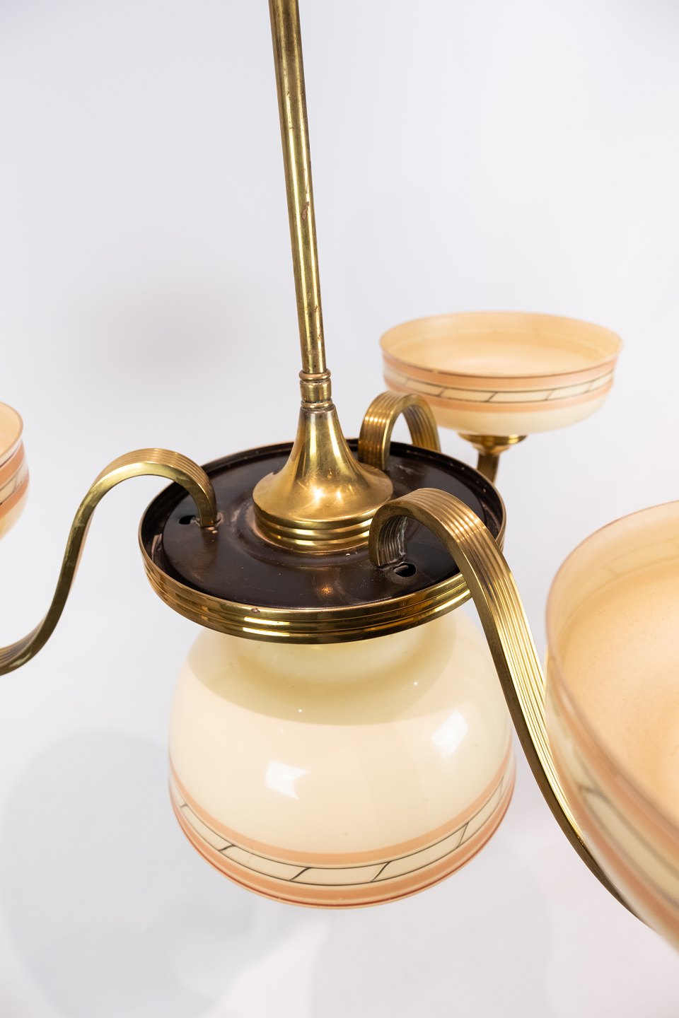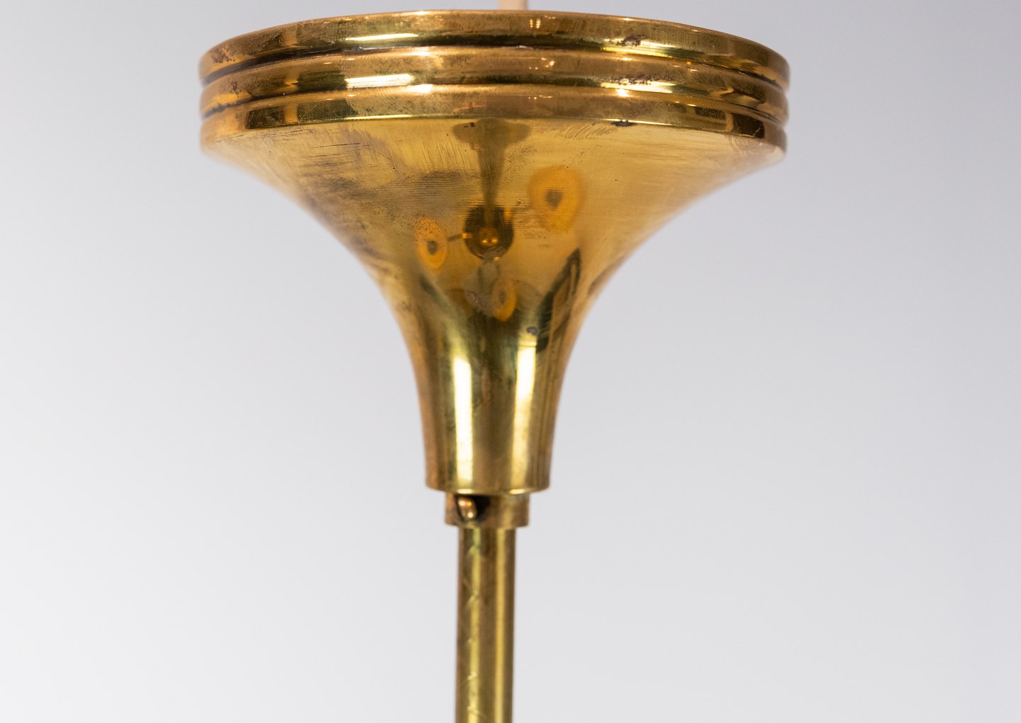 Ceiling pendant of brass and shades of opaline glass from the 1940s. The lamp is in great vintage condition.