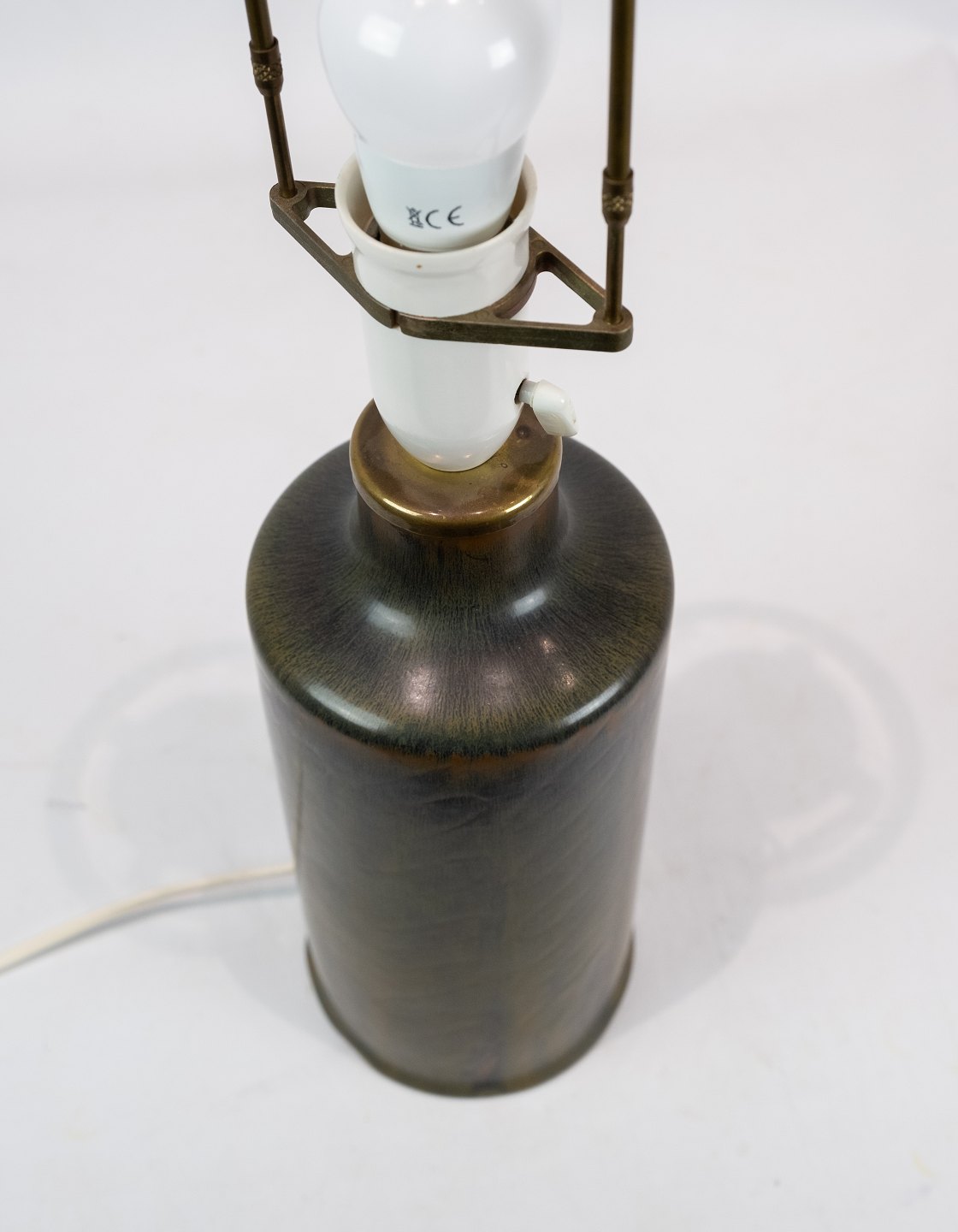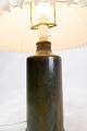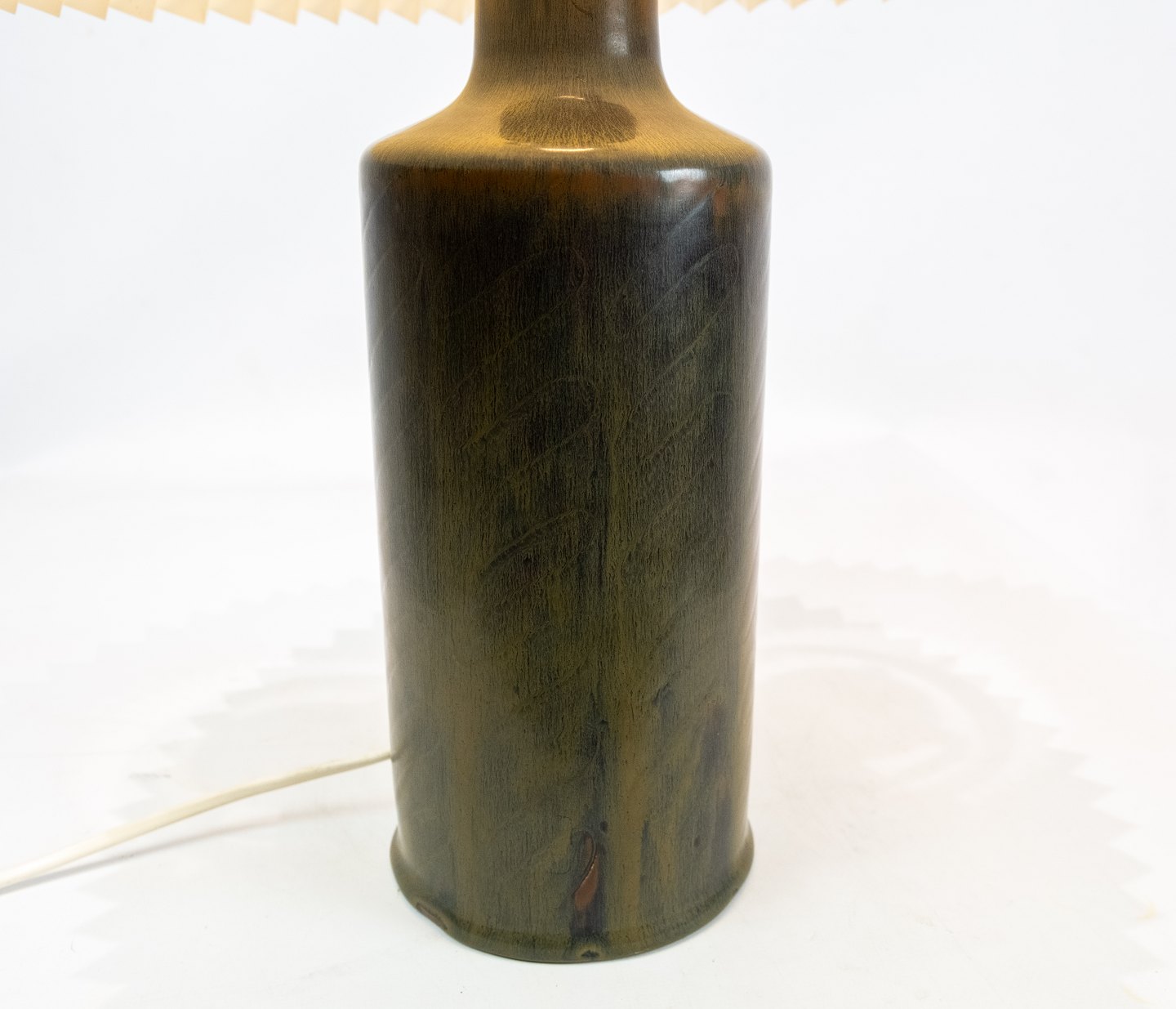 Ceramic table lamp in dark green color by Eva Stær Nielsen for Saxbo. The shade is hand folded and hand painted in paper.