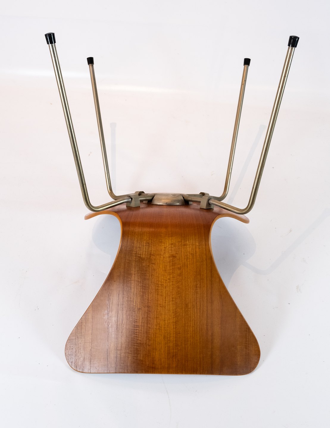 Et sæt af fire Syver stole, model 3107, designet af Arne Jacobsen og fremstillet af Fritz Hansen. Disse stole, i smukt teaktræ, udstråler en tidløs elegance og enestående håndværk.