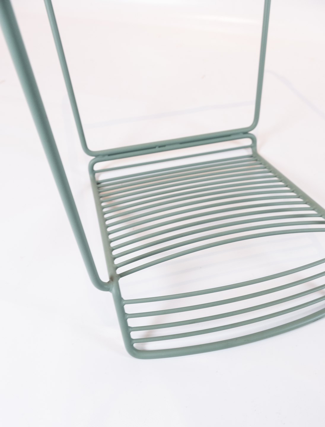 Det lakerede lyseblå metalstel giver en frisk og luftig fornemmelse, der passer perfekt til enhver moderne indretning. Stolens enkle linjer og lette udseende tilføjer et strejf af lethed til ethvert rum.