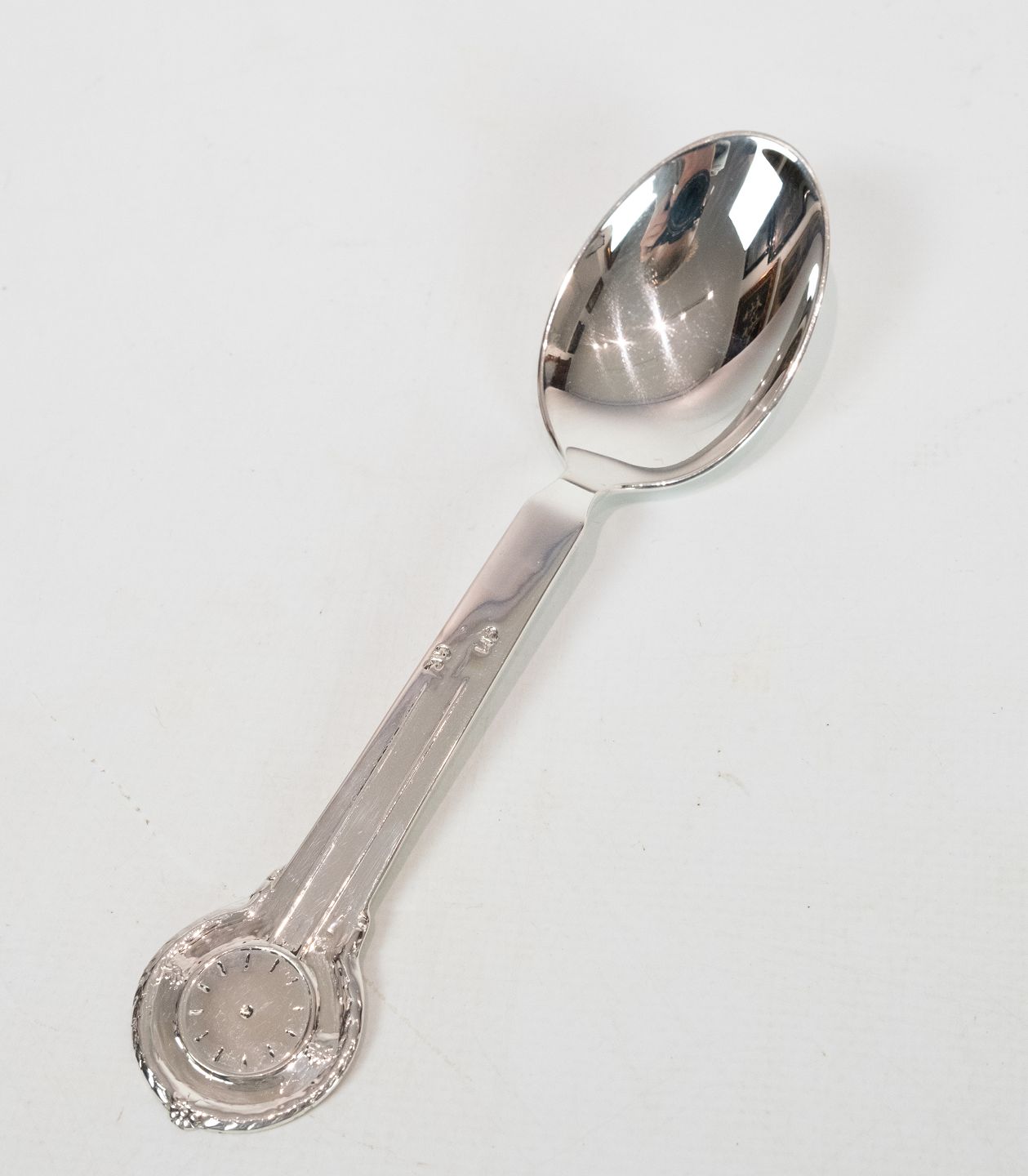 SoldChildren's spoon decorated with clock of hallmarked silver.