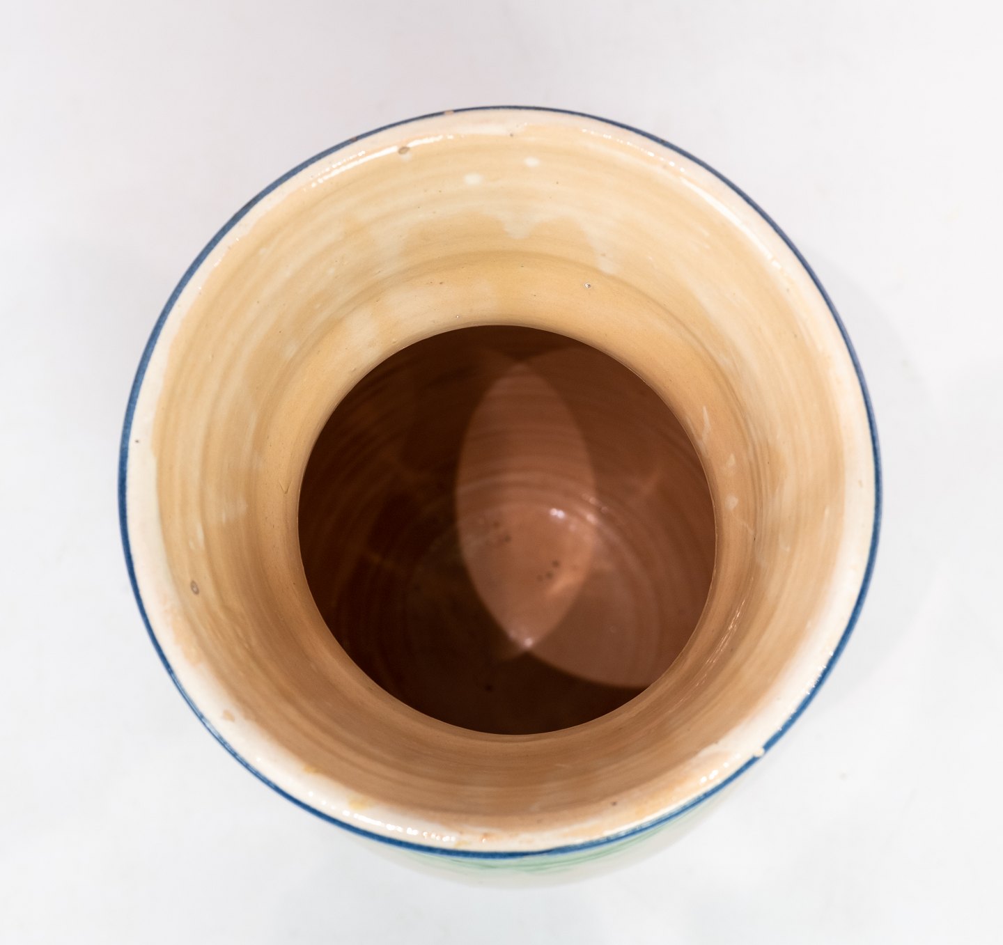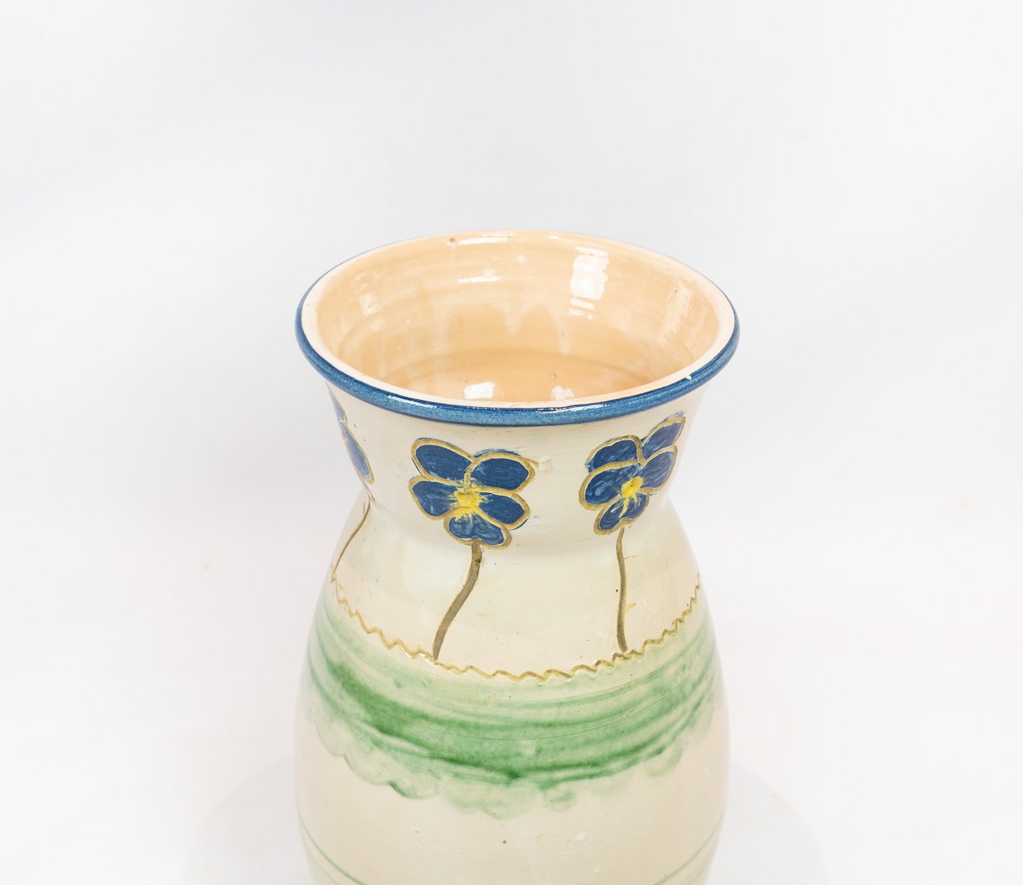 SoldCeramic floor vase in light color decorated with blue flowers. The vase is in great vintage condition.