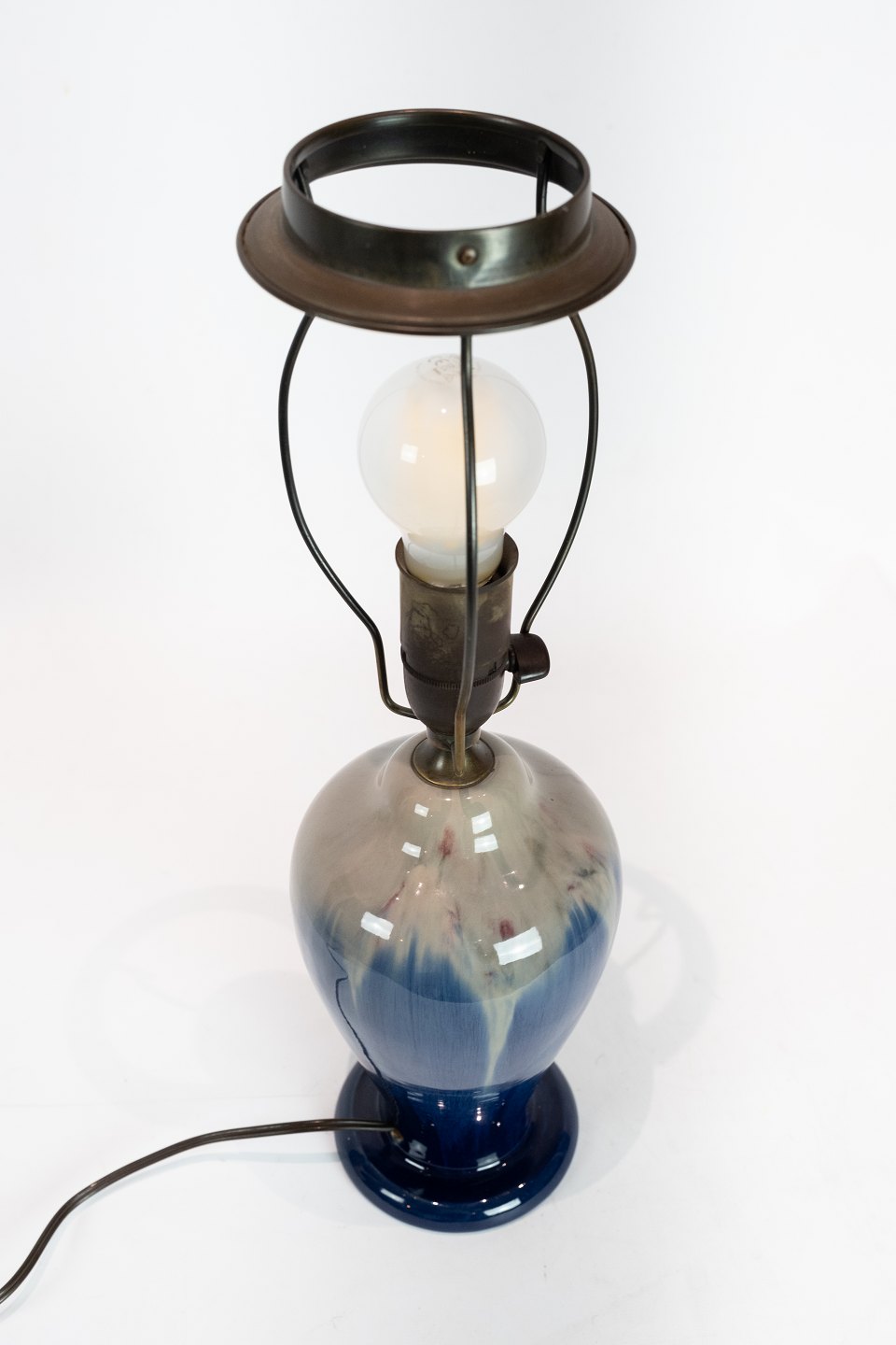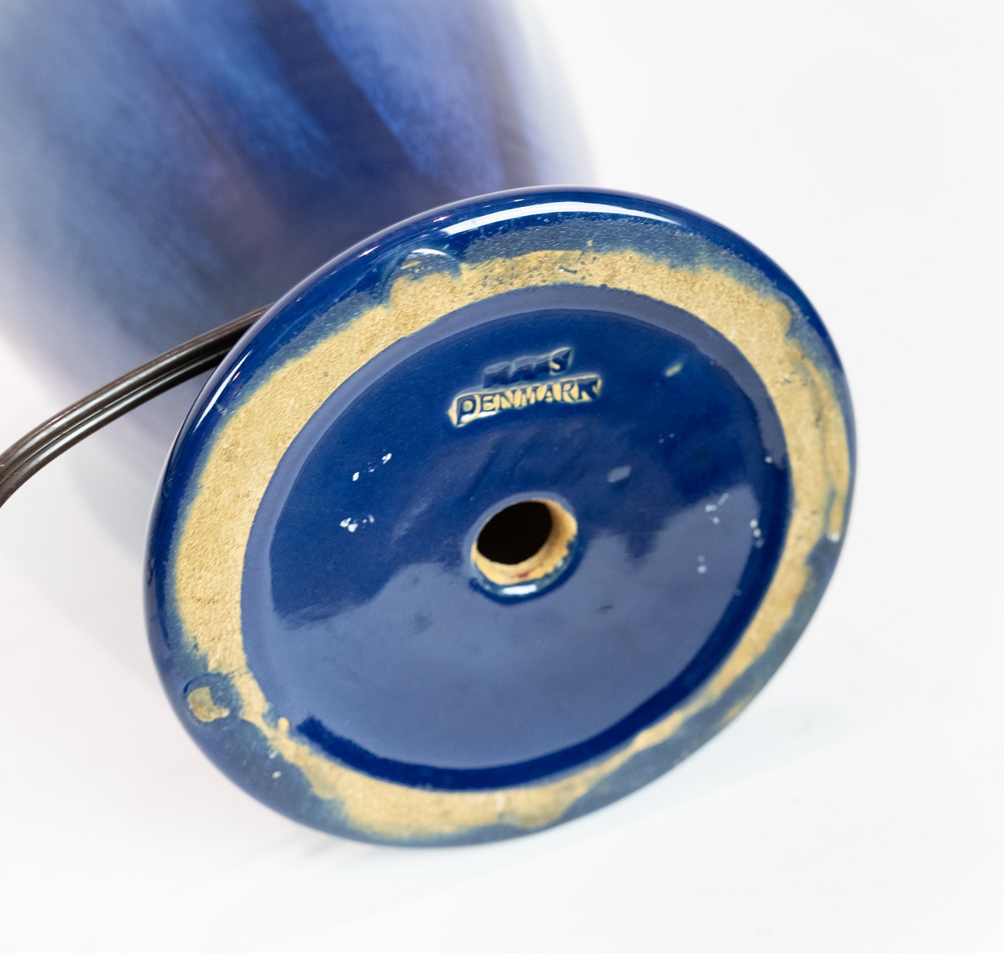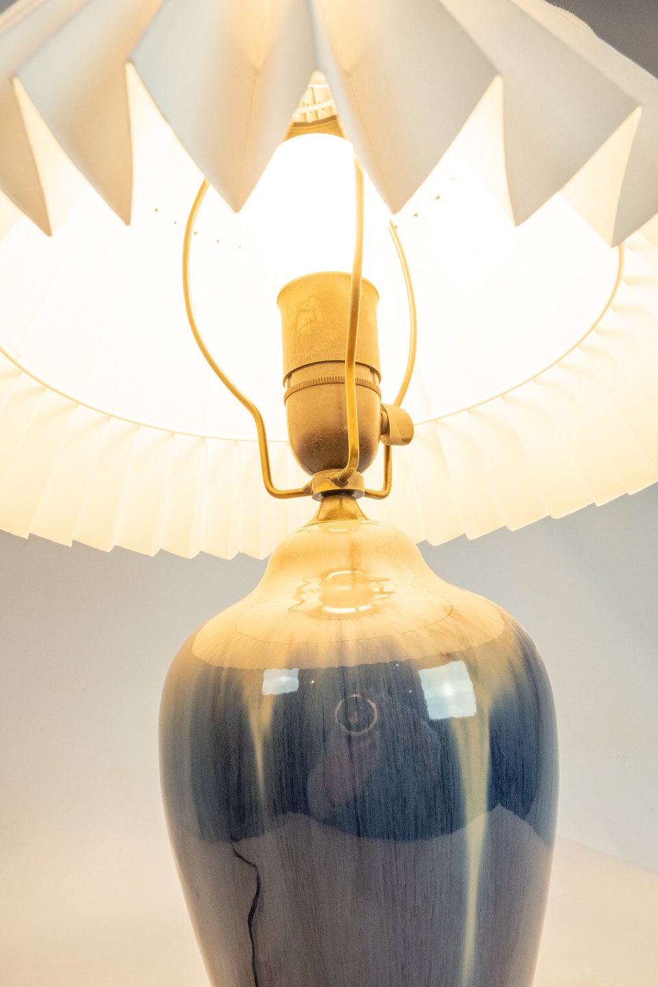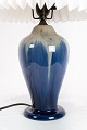 Tischleuchte aus Keramik mit dunkelblauer Glasur von Michael Andersen & Son. Der Schirm ist handgefaltet und handbemalt aus Papier.