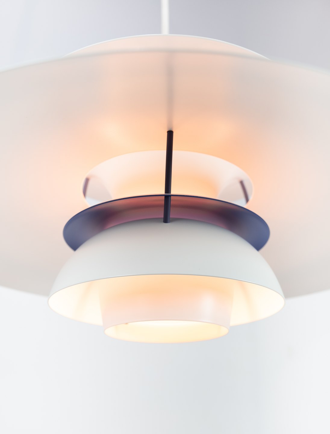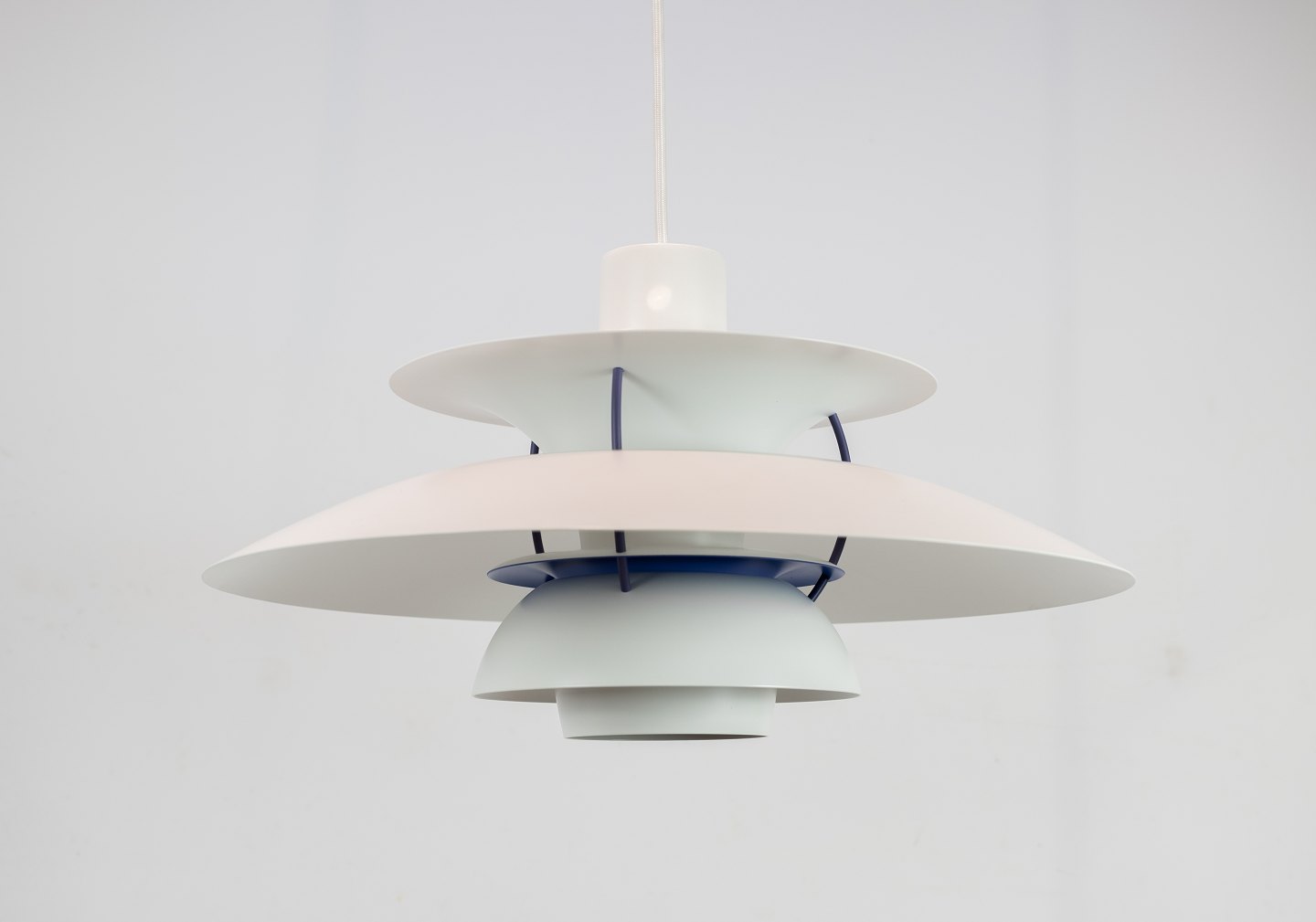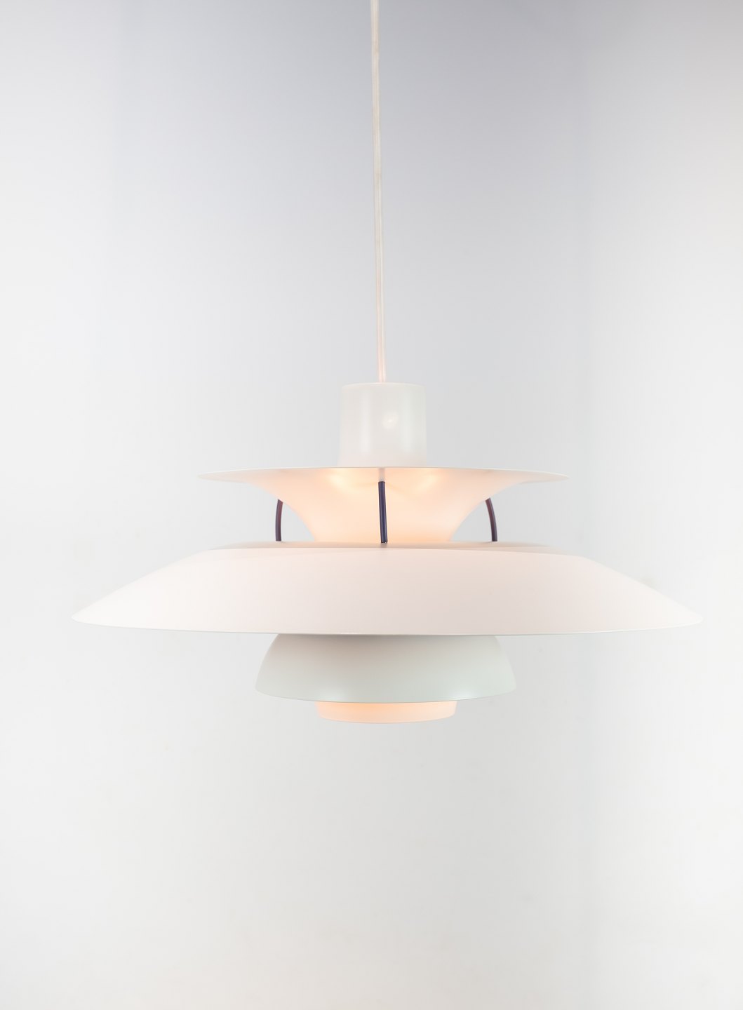 PH5 lampe designet af Poul Henningsen i 1958 og fremstillet af Louis Poulsen. Lampen har lakerede metal skærme i hvid og af nyere model.