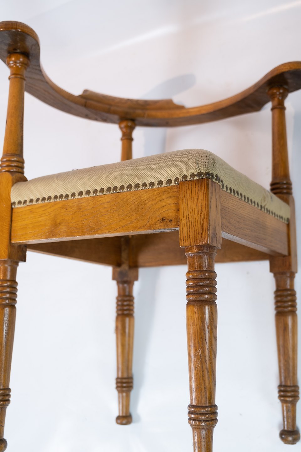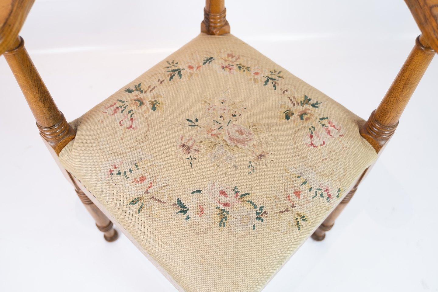 Armstol i poleret egetræ og polstret med lyst broderet stof fra 1910erne. Stolen er i flot antik stand.