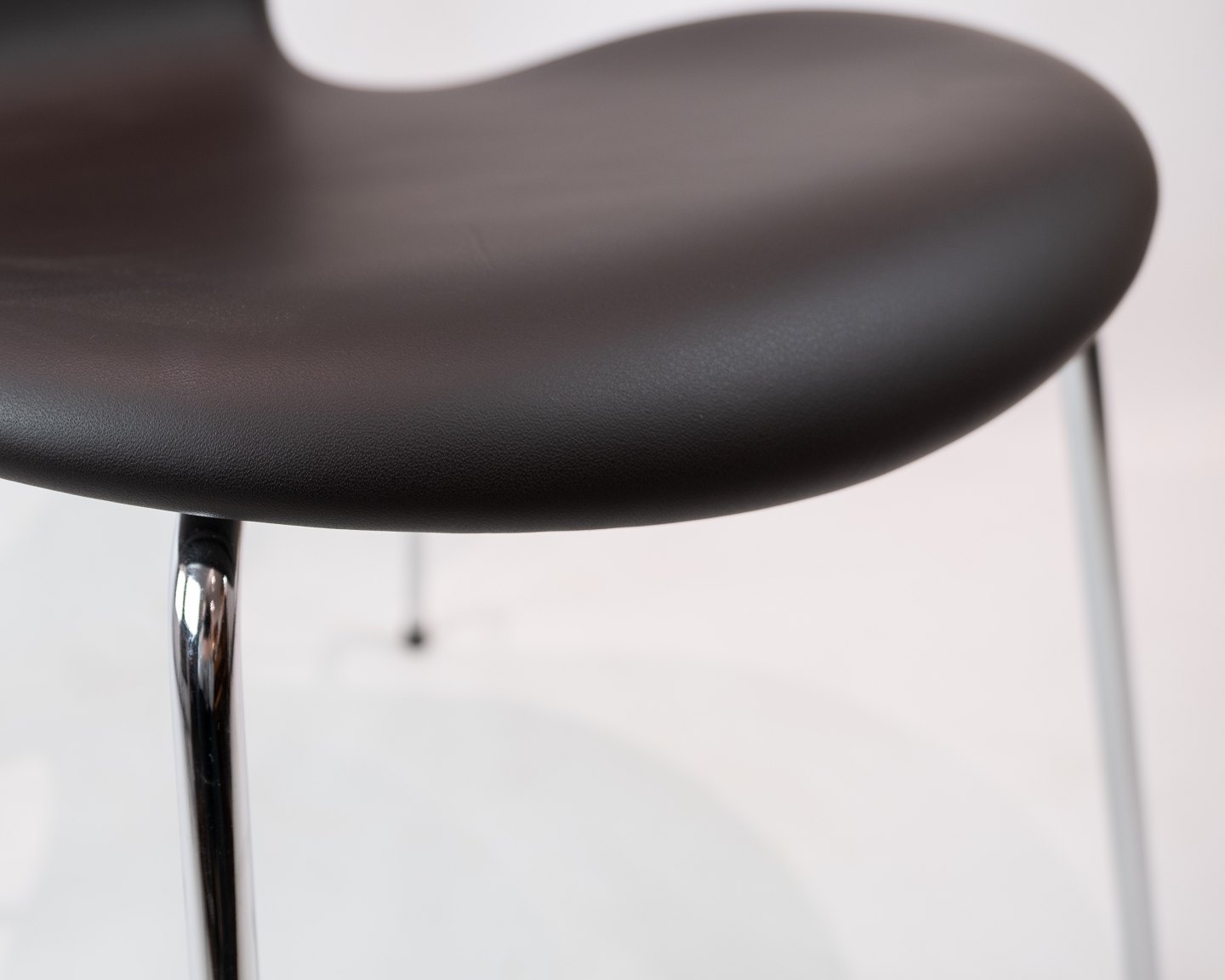 The Seven chair, also known as model 3107, designed by the legendary Arne Jacobsen and manufactured by Fritz Hansen. These iconic chairs have been newly upholstered in brown mocha Elegance leather, giving them a timeless and luxurious look.