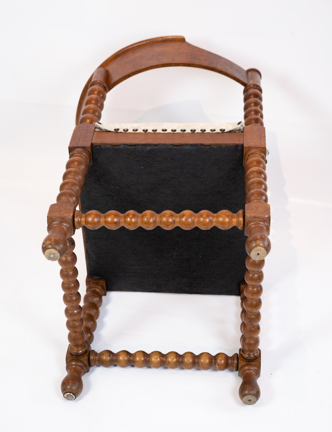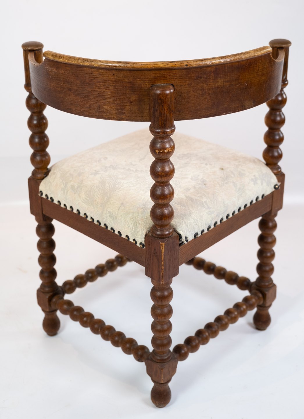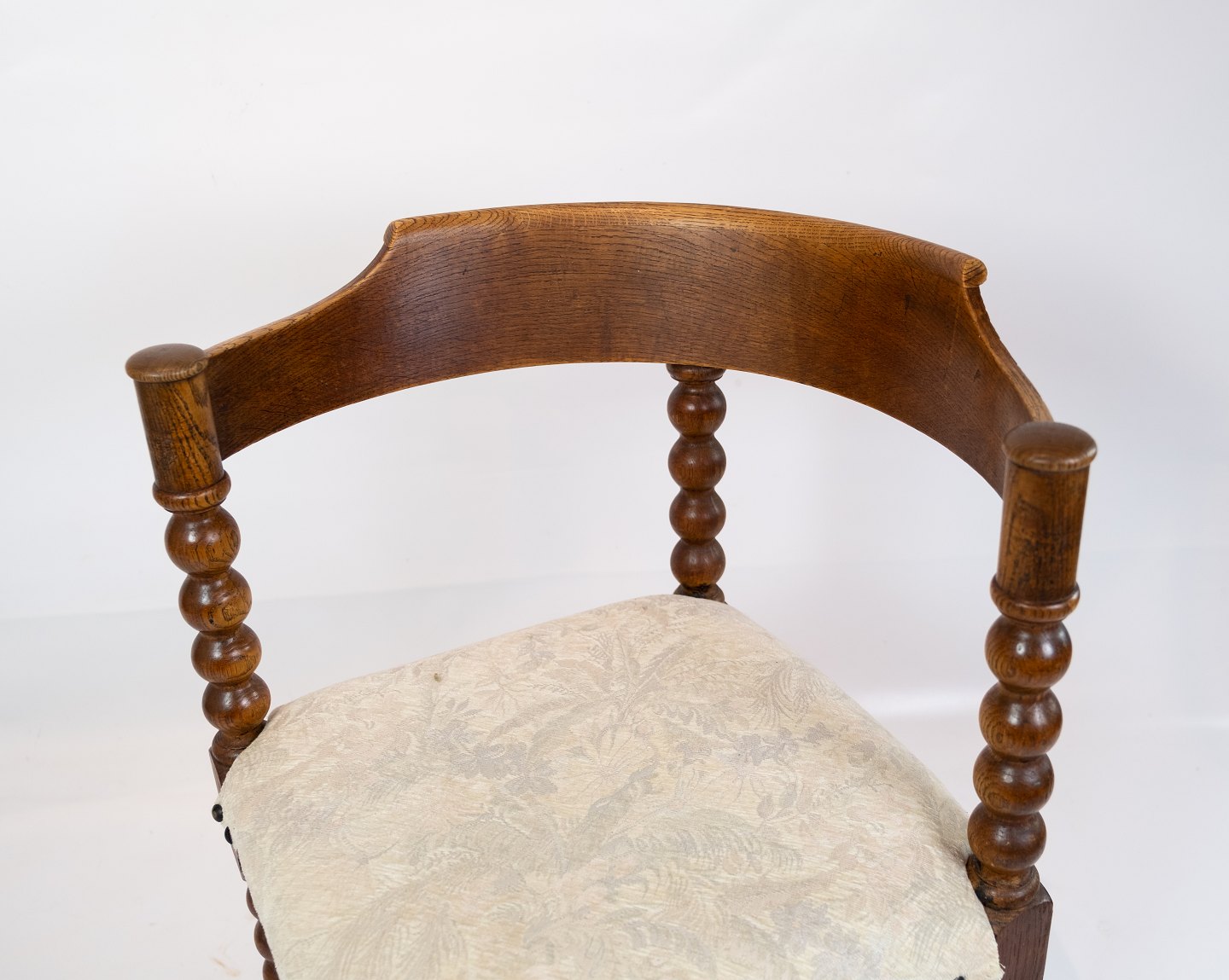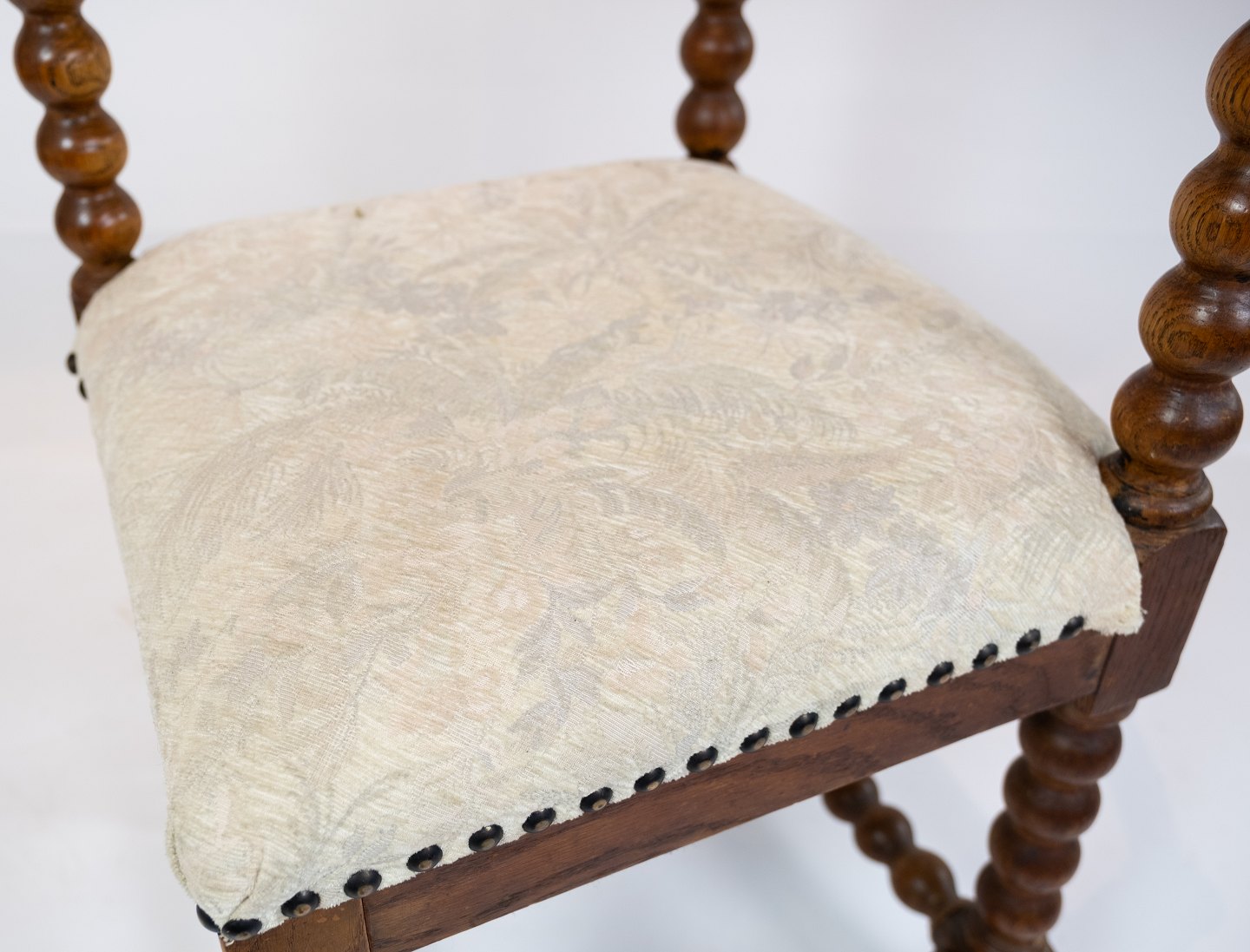 Antik stol med udskæringer af eg og polstret med lyst stof fra 1920erne.