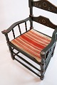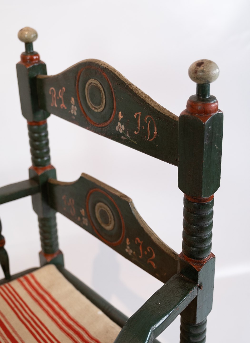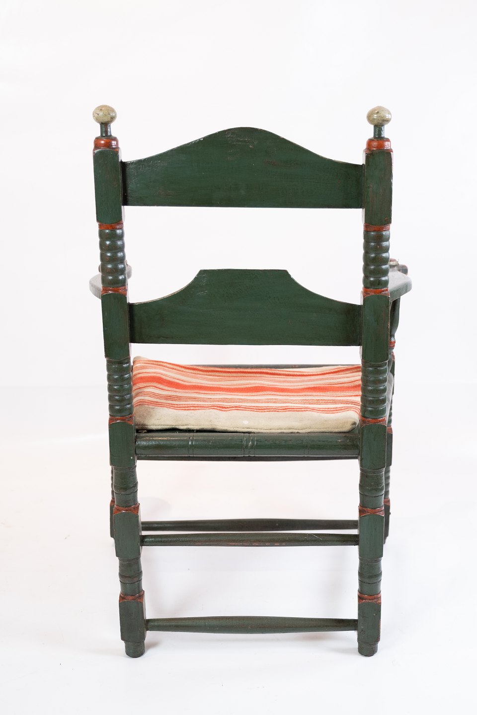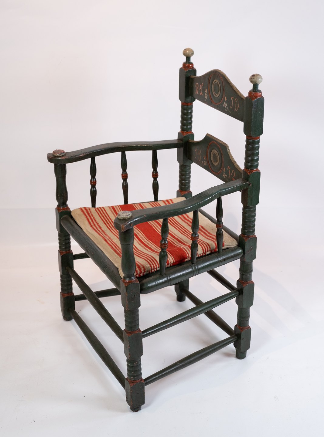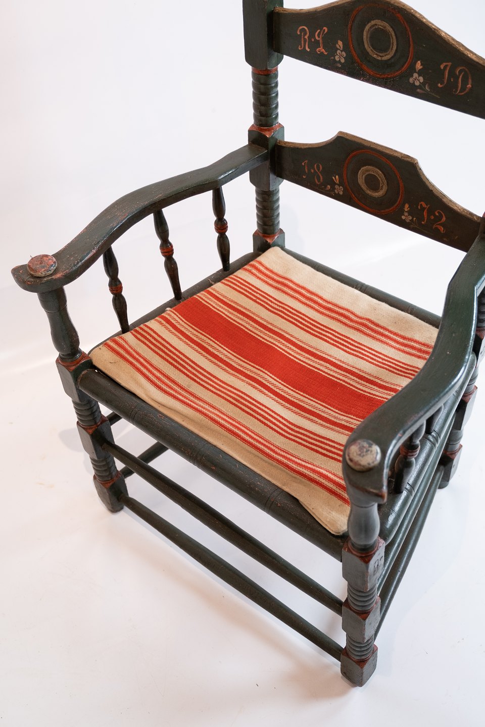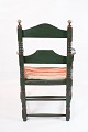 Antiker grün gefasster Armlehnstuhl, bezogen mit gestreiftem Stoff, aus dem Jahr 1872. Der Stuhl befindet sich in sehr gutem Vintage-Zustand.