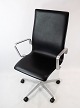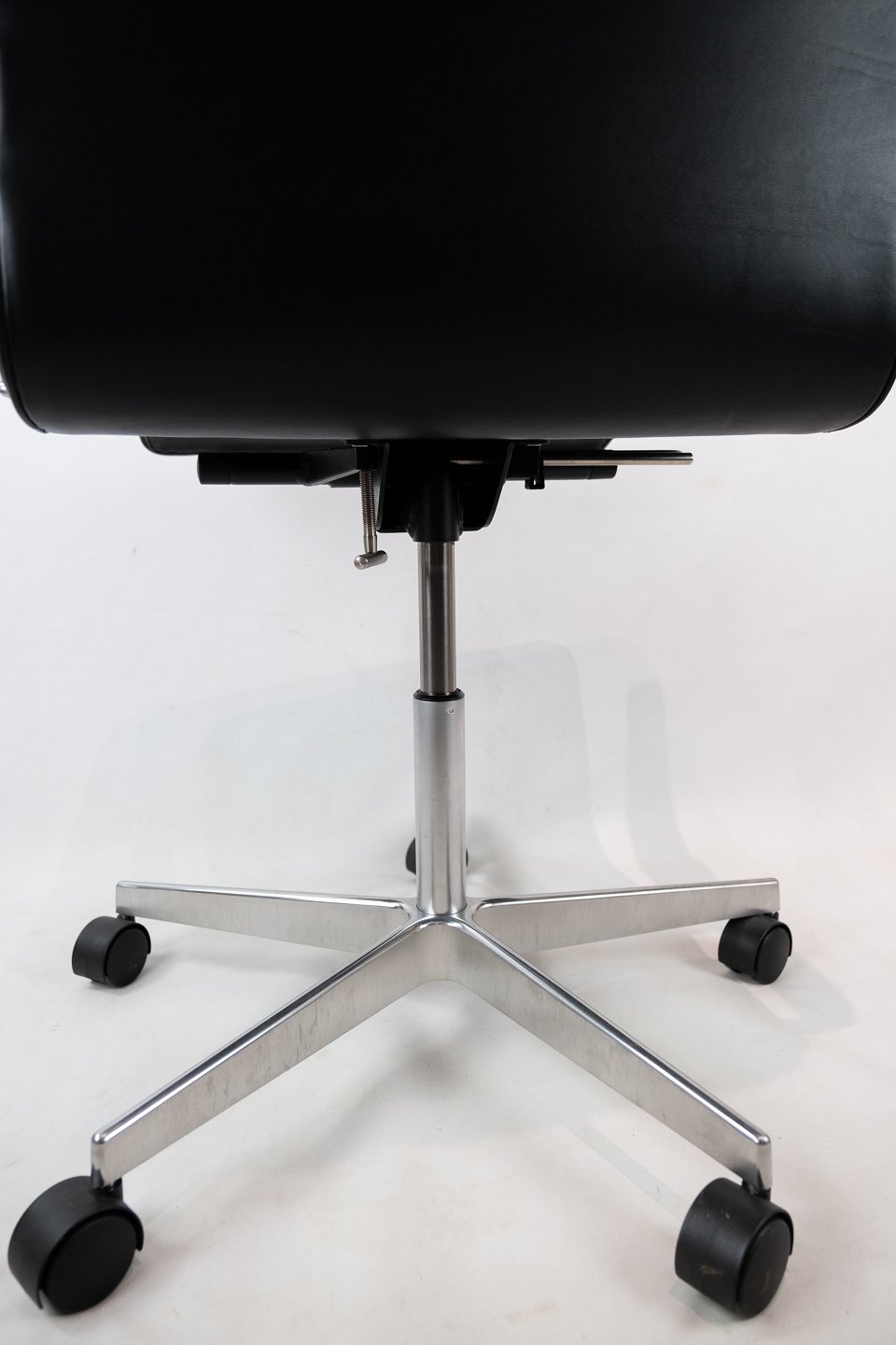 The chair is upholstered with original black leather, which adds a luxurious touch to its appearance and ensures a comfortable sitting experience. The elegant and ergonomic shape of the chair is characteristic of Jacobsen's design style and reflects his focus on both aesthetics and comfort.