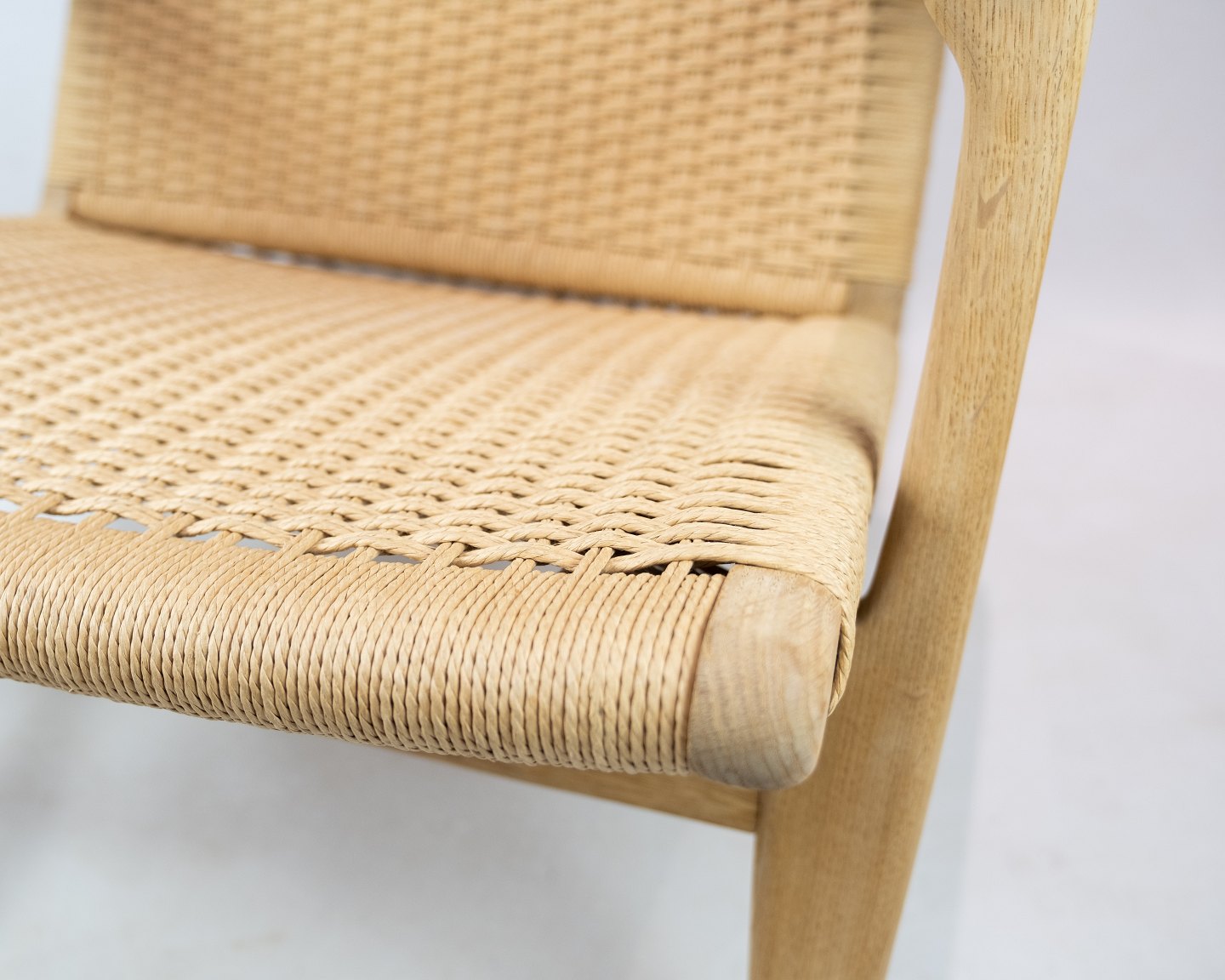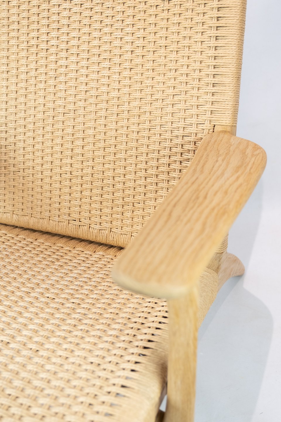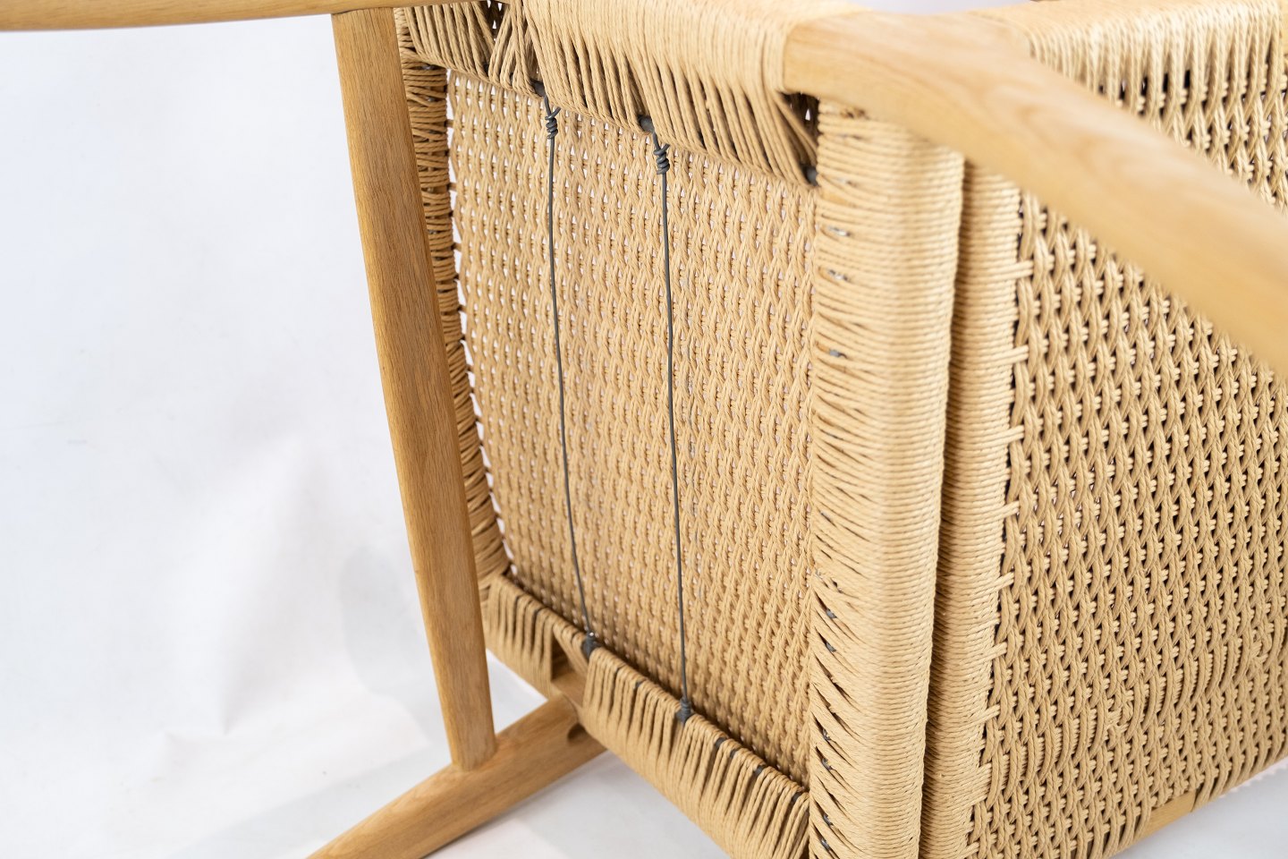 The chair's frame is made of solid oak, which gives it both strength and natural beauty. The paper braid that covers the seat and backrest adds an organic texture and artisanal expression that is characteristic of Wegner's designs.