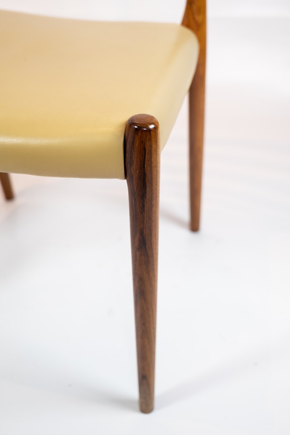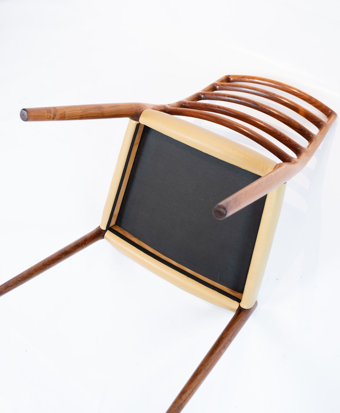 Sættet består af fire spisestuestole, model 82, designet af den anerkendte møbeldesigner N.O. Møller i 1960'erne. Disse elegante stole er fremstillet af palisander, hvilket giver dem en varm og tidløs æstetik, der passer perfekt til ethvert spiseområde eller køkken.