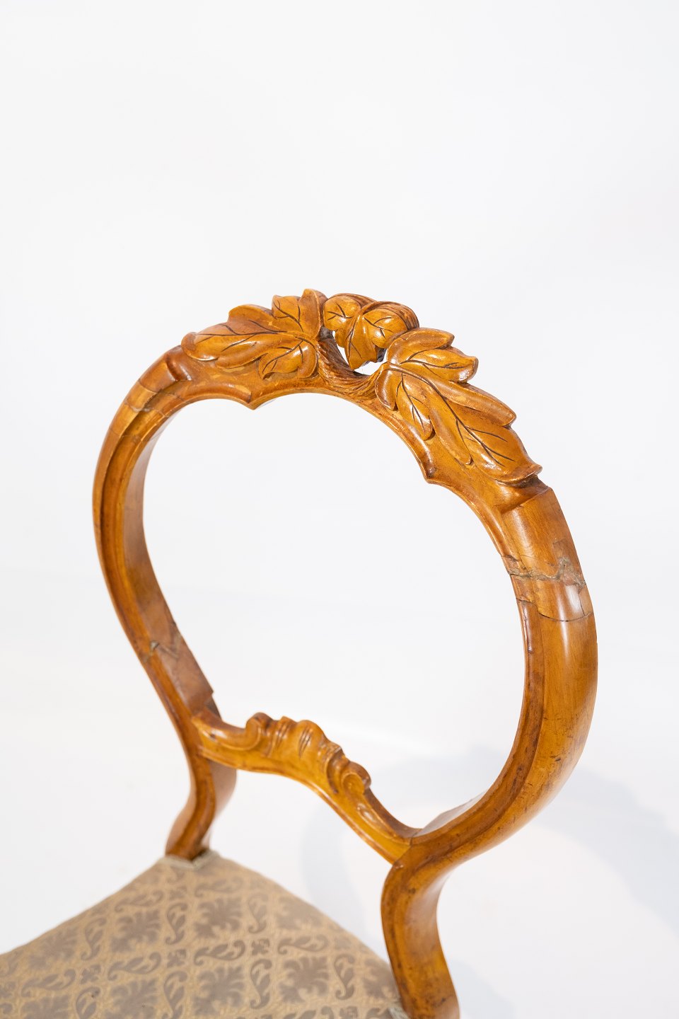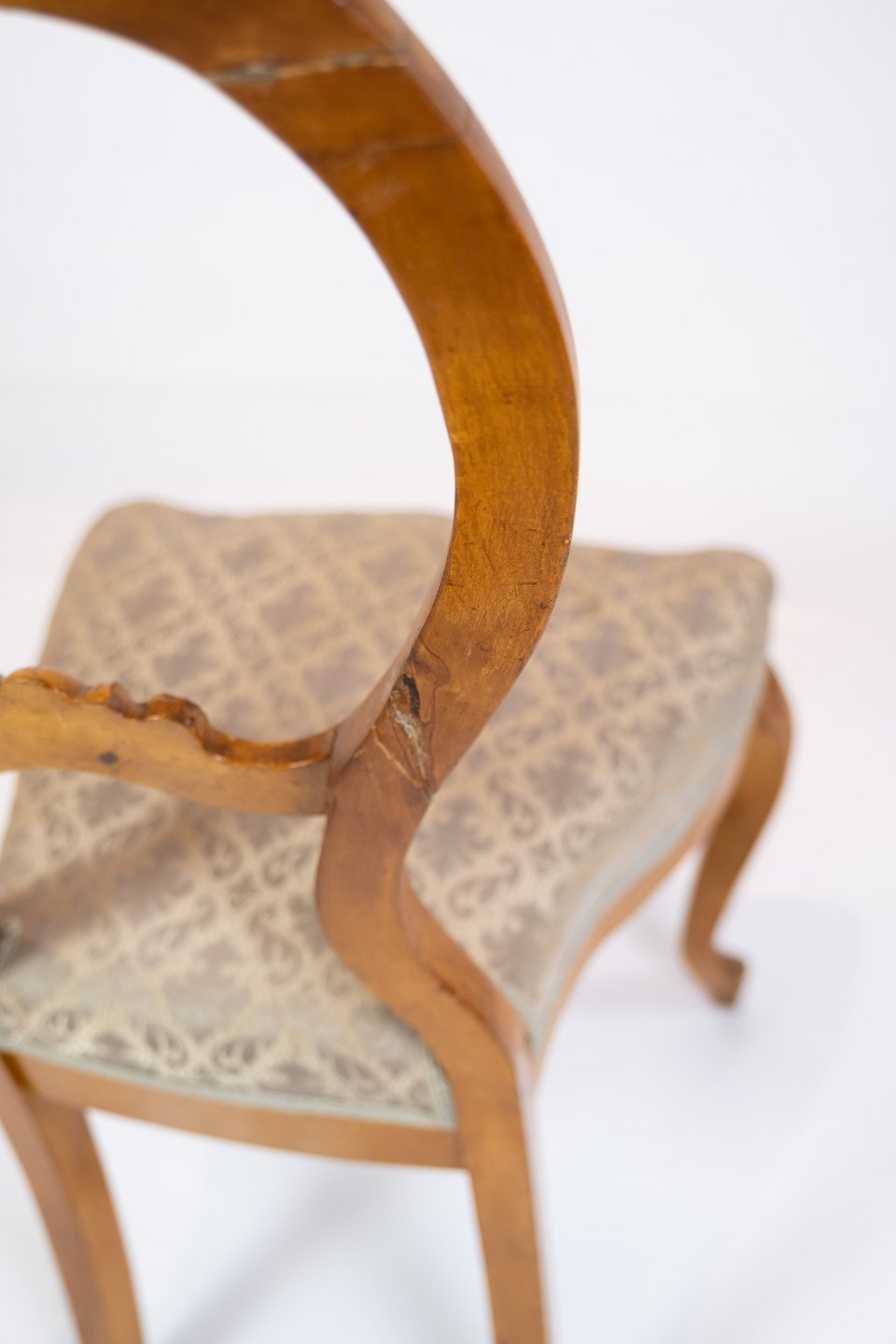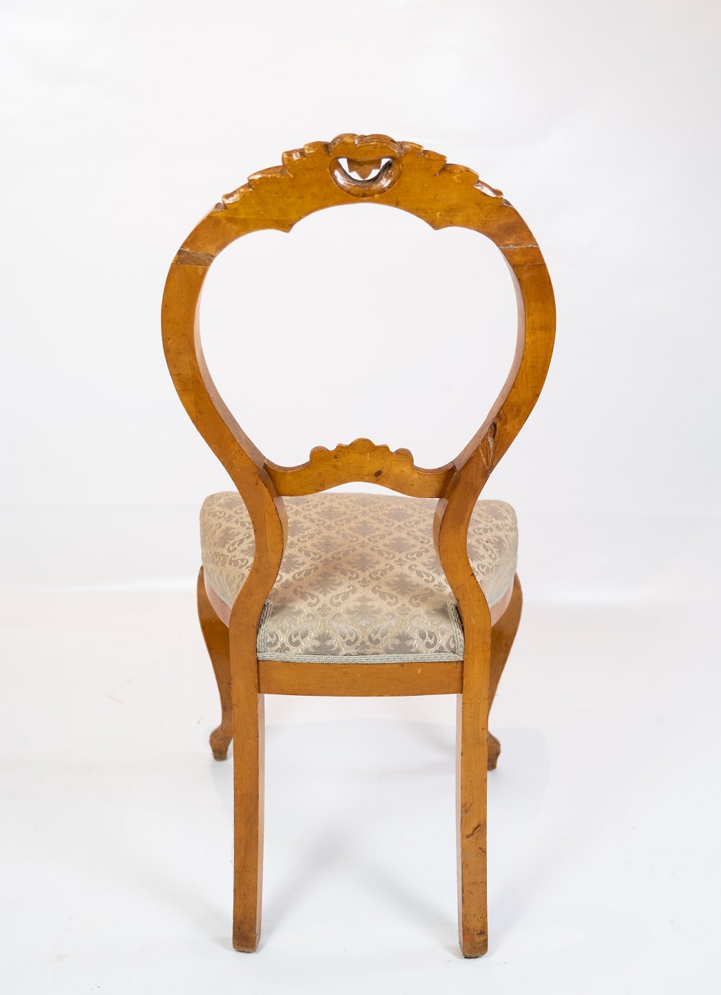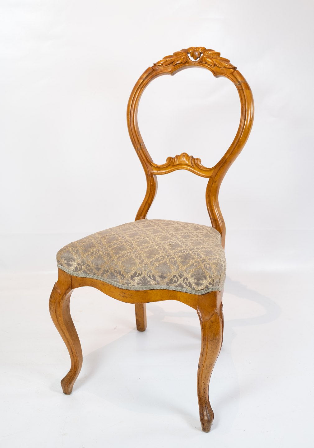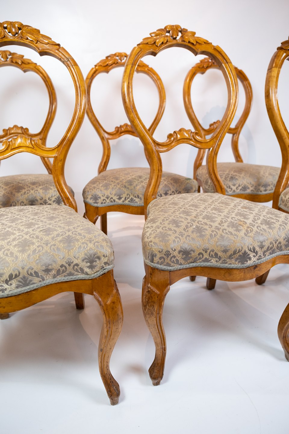 Satz von sechs Rokoko-Esszimmerstühlen aus hellem Mahagoni, bezogen mit gemustertem Stoff, um 1760. Die Stühle befinden sich in sehr gutem Vintage-Zustand.